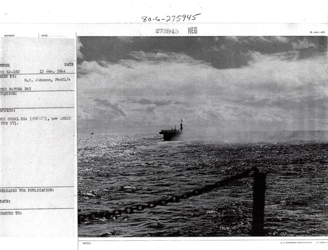 121k | "USS Coral Sea (CVE-57), now Anzio (CVE-57)." Photographed from USS Natoma Bay (CVE-62) by R.N. Johnson, PhoM1/c. Photo # CVE 62-182, dated 13 January 1944. National Archives photo (# 80-G-275945). |