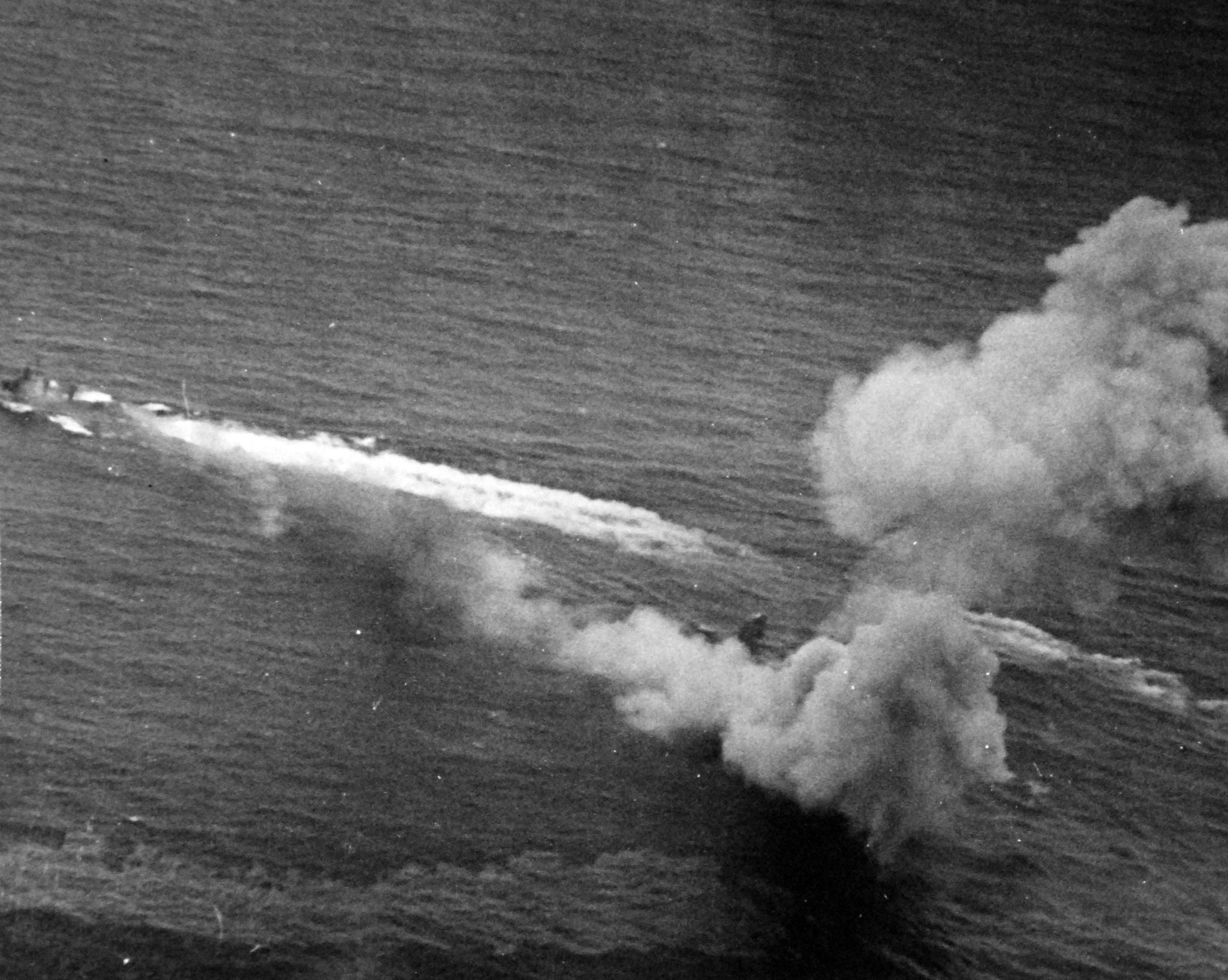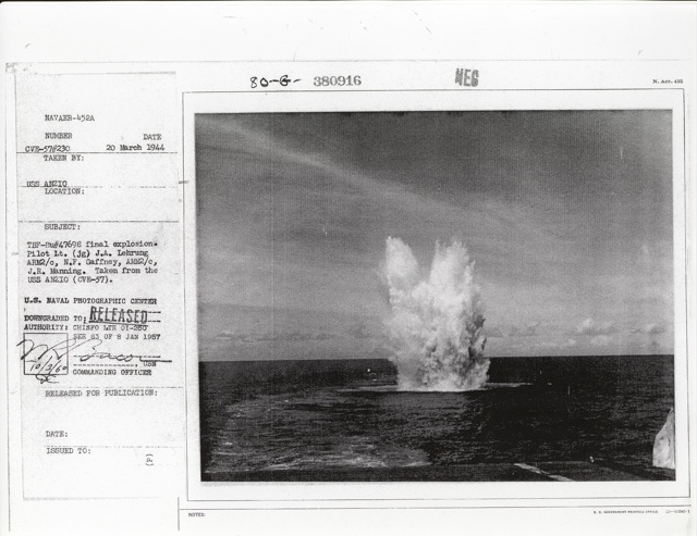 97k | "TBF[-1C]-Bu#47698 final explosion. Pilot Lt. (jg) J.A. Lehrung, ARM2/c, N.F. Gaffney, AMM2/c, J.R. Manning. Taken from the USS Anzio (CVE-57)." Photo # CVE-57#230, dated 20 March 1944 (note that CVE-57's name was Coral Sea on this date). National Archives photo (# 80-G-380916). |