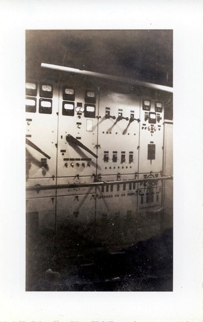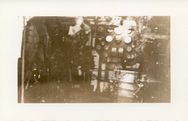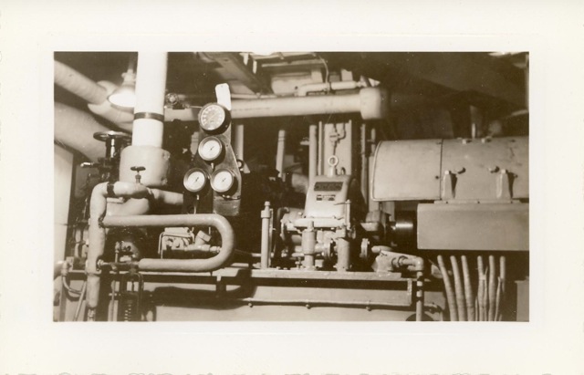 115k | "The jack-controls on the starboard catwalk of the USS Anzio (CVE-57). Manning the arresting gear controls, with an anxious eye on a plane that is about to hit the deck are Bob Christensen, Jim Bough, L.D. Smith, and Frank Schwartz." Photo # CVE57-479, dated 20 April 1945. National Archives photo (# 80-G-335643). |