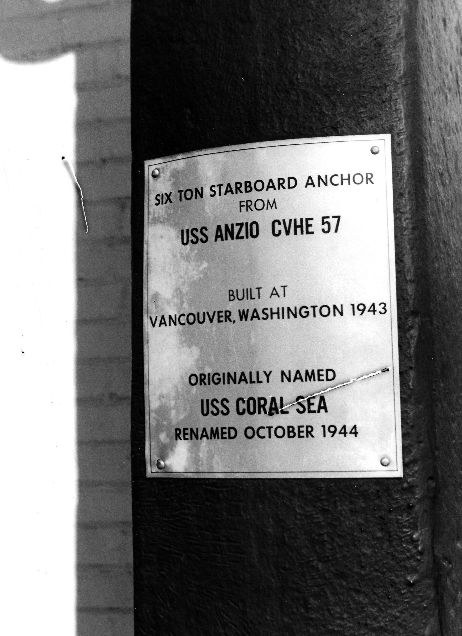 366k | This artifact sign used to be on display on the anchor. It reads, "Six Ton Starboard Anchor from USS Anzio CVHE 57 / Built At Vancouver, Washington, 1943 / Originally named / USS Coral Sea / Renamed October 1944". National Museum of the U.S. Navy Photograph Collection, # NMUSN-648. |