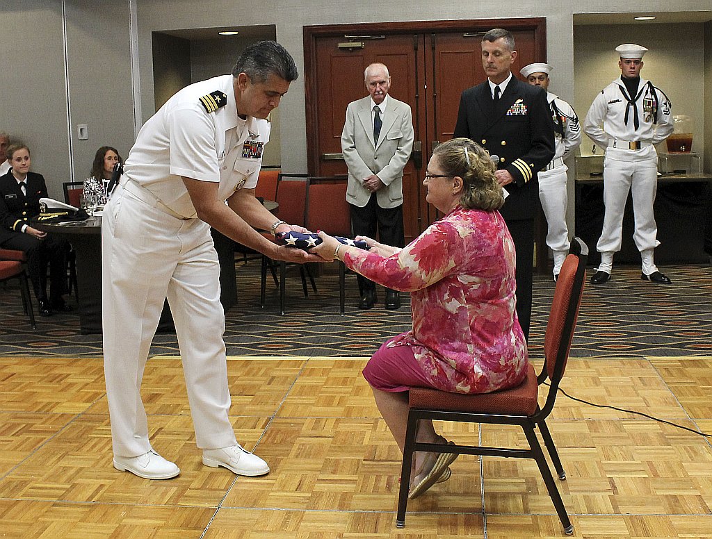 247k | CDR Ed Morales, commanding officer of Navy Recruiting District Dallas, presents the national ensign to Clissa Spratlin England during the USS Anzio reunion ceremony, 23 August 2014. England's father, Courtney B. Spratlin, passed away earlier in the year. The annual reunion honors the men who served aboard Anzio during World War II. U.S. Navy photo by Mass Communication Specialist 2nd Class Jonathan Vargas (# 140823-N-GF386-055). |