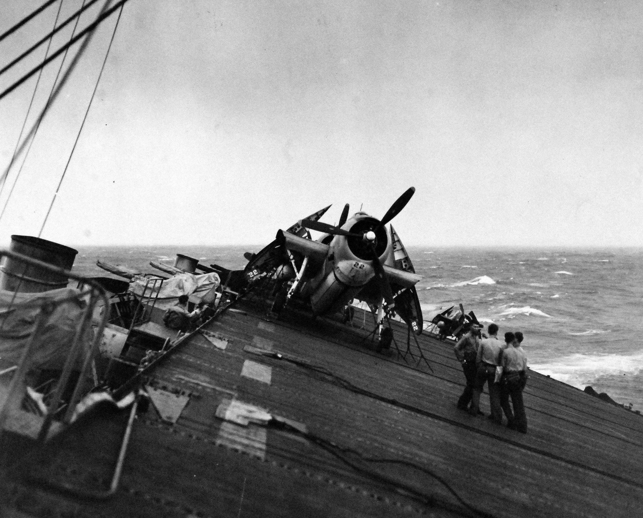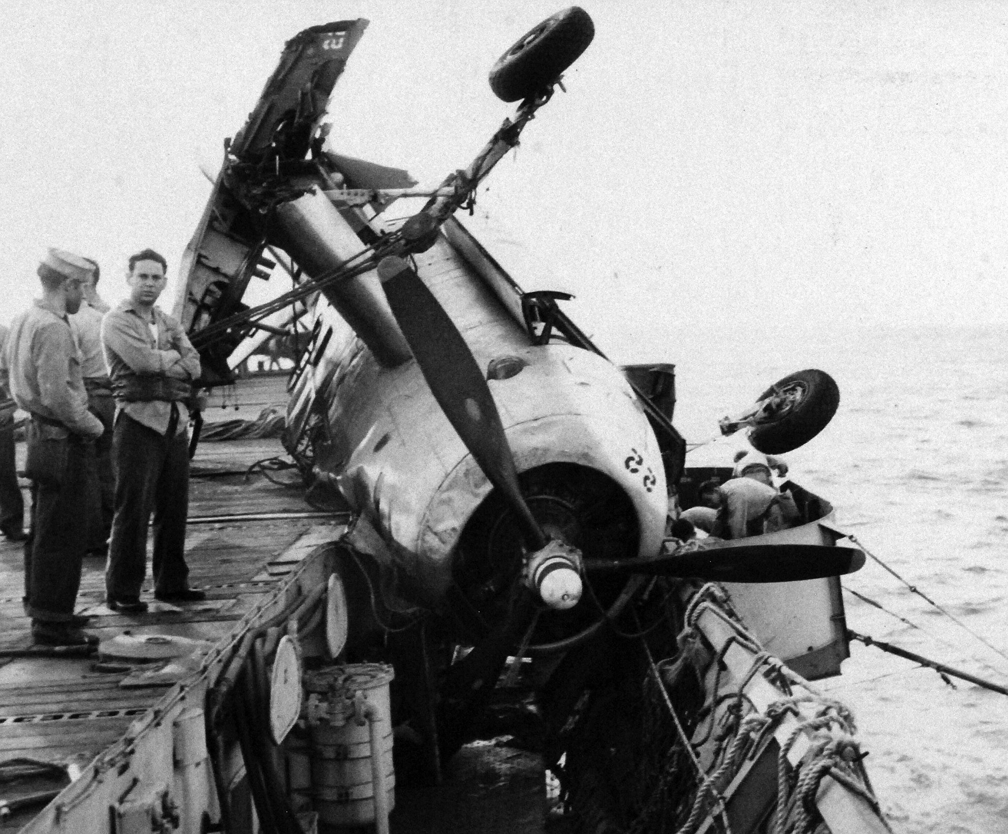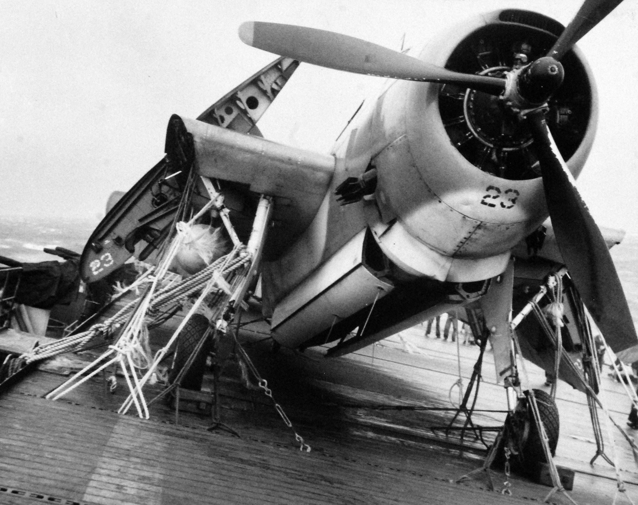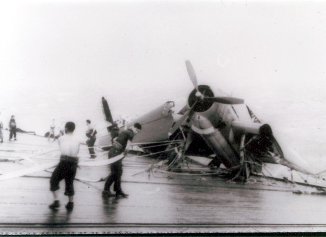 landing due to tail hook breaking off, on the USS Coral Sea (CVE-57). National Archives photo (# 80-G-86020). |