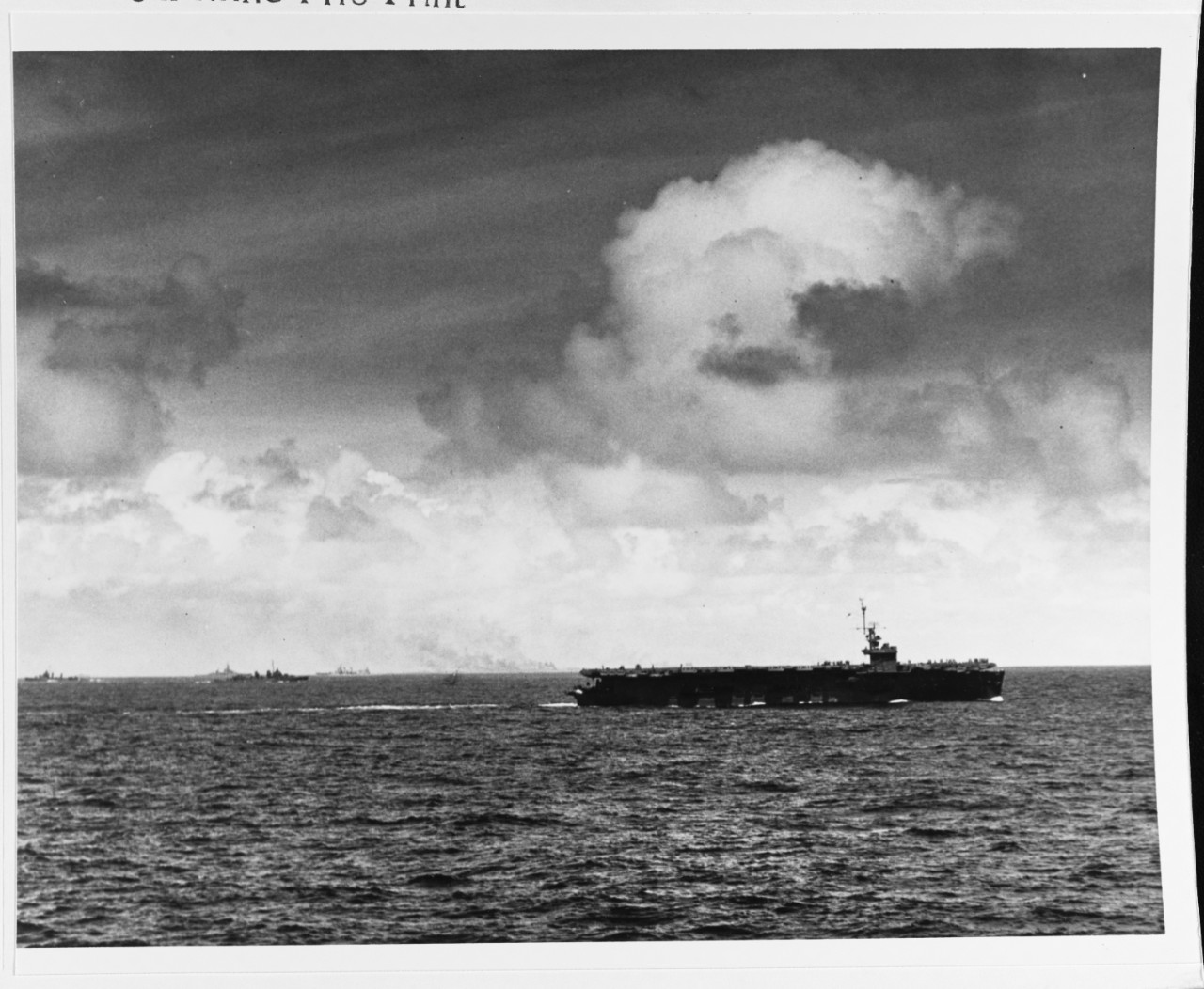 112k | "The USS Coral Sea (CVE-57) off Kwajalein Atoll during the attack on Marshall Islands. Kwajalein Is. burning in background. As seen from USS Manila Bay (CVE-61)." Photo # MNLB-239, dated 1 February 1944. National Archives photo (# 80-G-372886). |