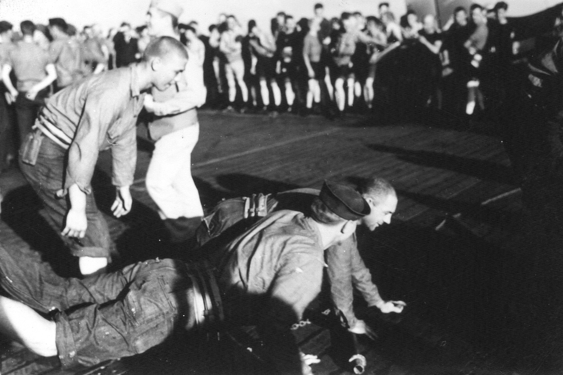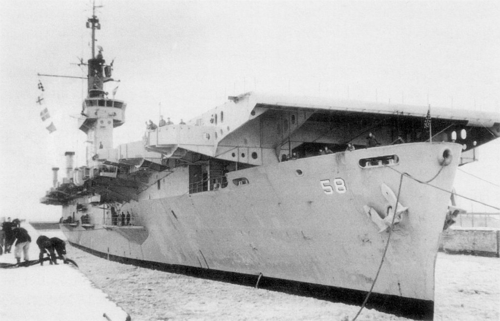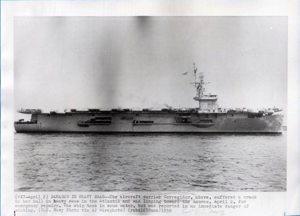 81k | "DAMAGED IN HEAVY SEAS—The aircraft carrier Corregidor, above, suffered a crack in her hull in heavy seas in the Atlantic and was limping toward the Azores, April 2, for emergency repairs. The ship took in some water, but was reported in no immediate danger of sinking. (U.S. Navy Photo via AP Wirephoto)" [1958]. |