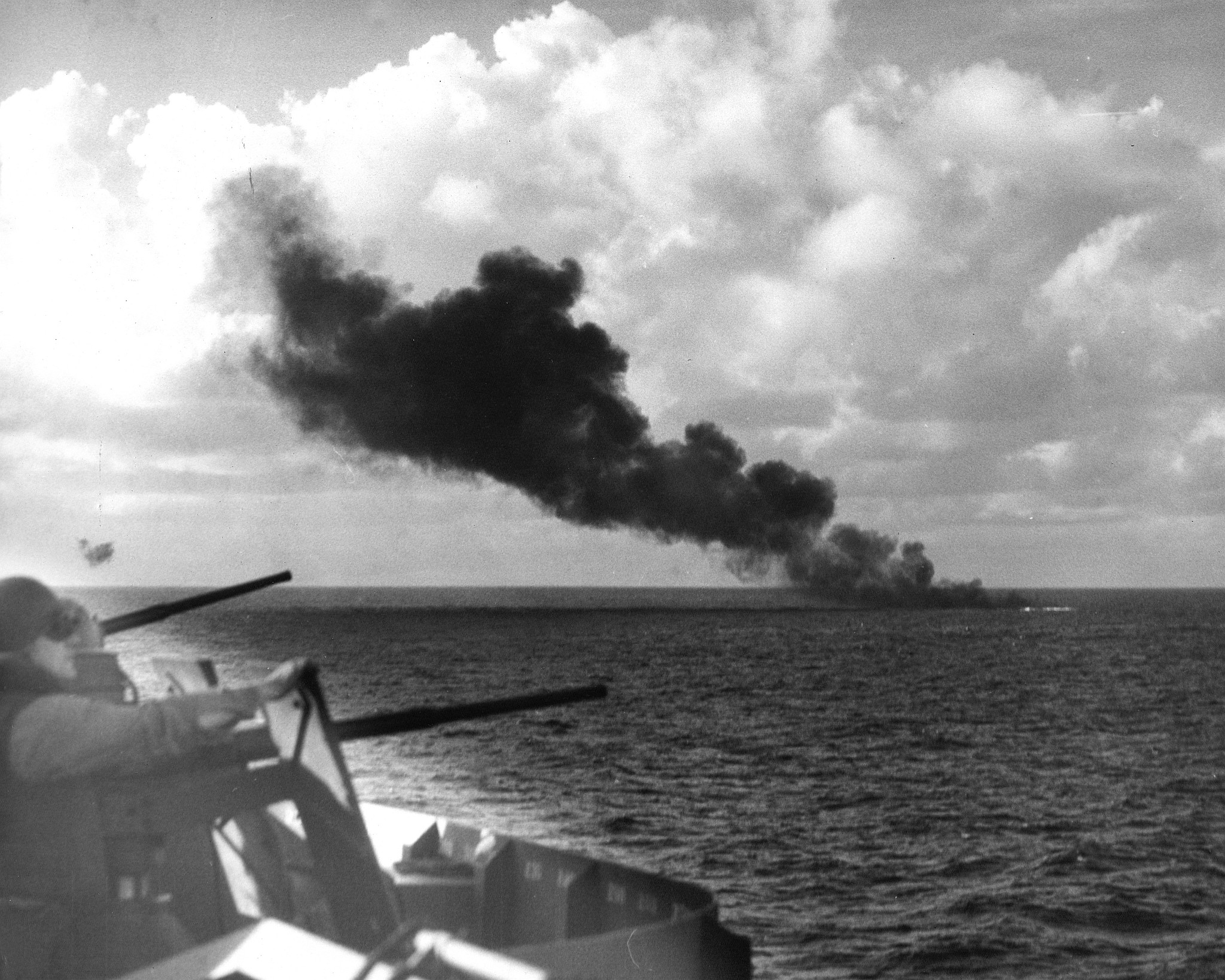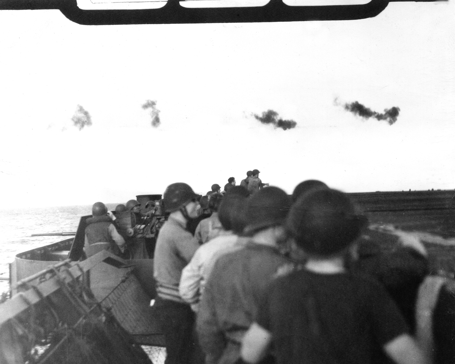 97k | "The USS Corregidor (CVE-58) of Task Unit 52.11.2 throws up anti aircraft fire as Jap planes make torpedo runs at dusk off Saipan I. in Marianas. Taken from USS Coral Sea (CVE-57)." "Burning plane explodes close astern." Photo # CRLS 317, dated 17 June 1944. National Archives photo (# 80-G-238304). |