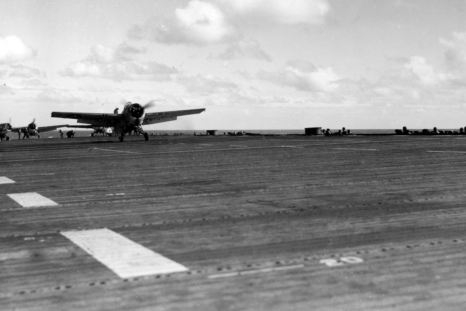 100k | "The USS Corregidor (CVE-58) of Task Unit 52.11.2 throws up anti aircraft fire as Jap planes make torpedo runs at dusk off Saipan I. in Marianas. Taken from USS Coral Sea (CVE-57)." "FM-2 takes off during heighth [sic] of attack: Burning plane and fire can be seen in background." Photo # CRLS 319, dated 18 June 1944. National Archives photo (# 80-G-238305). |