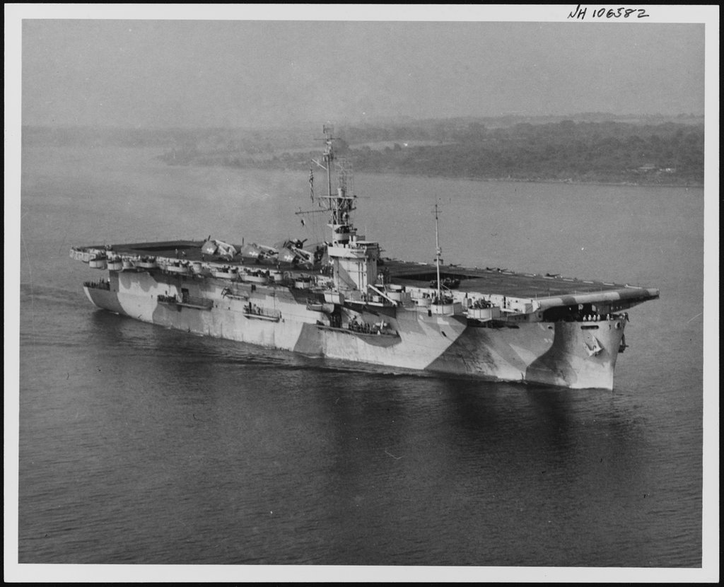 122k | USS Mission Bay operated primarily as an ASW carrier in the Atlantic. She is shown on 10 August 1944, off the East Coast, wearing Measure 32 Design 4A camouflage. Note Hellcats on deck and the large SK air search radar antenna on the mast. Official U.S. Navy Photograph, from the collections of the Naval History and Heritage Command (# NH 106582). |
