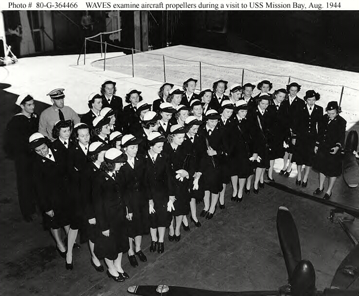 357k | Visiting WAVES examine aircraft propellers while they tour USS Mission Bay (CVE-59), 20 August 1944. Official U.S. Navy Photograph, now in the collections of the National Archives (# 80-G-364466). |