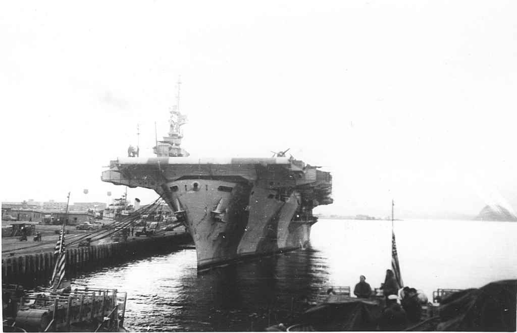 120k | Charles Parkhurst was an Aerial Photographer aboard the first USS Hornet (CV-8) up to her sinking, then aboard USS Baffins (CVE-35), and finally aboard USS Mision Bay (CVE-59), where these two photos from his collection would have been taken. (Special thanks to Robert M. Cieri, who scanned the original photographs.) |