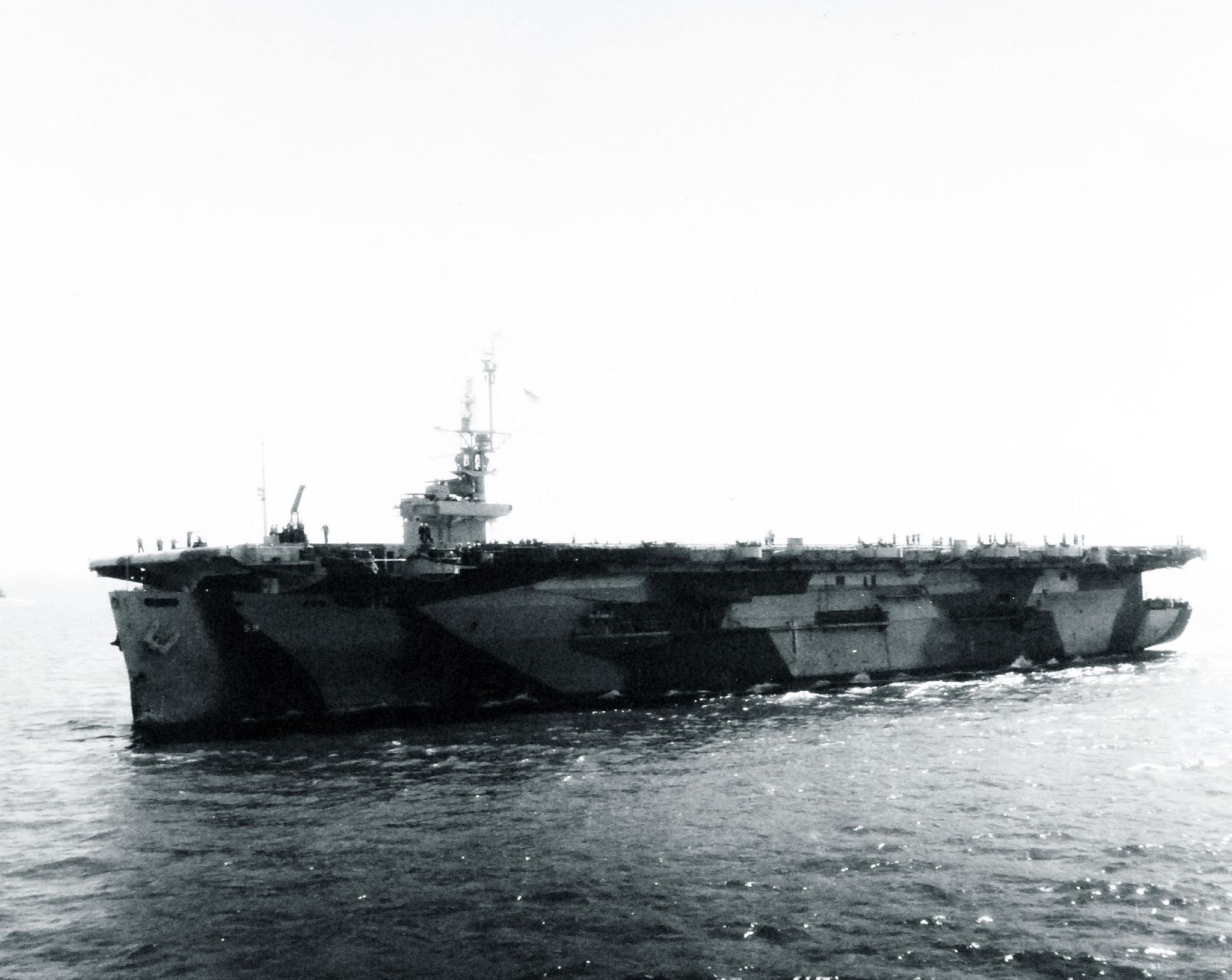 185k | USS Mission Bay (CVE-59) underway, location and date unknown (probably 1945.) Note the lighter color island, compared to the Measure 21 hull up to the flight deck. Several CVE's wore this modified scheme in 1945. US Navy photo, via US Naval Institute. |