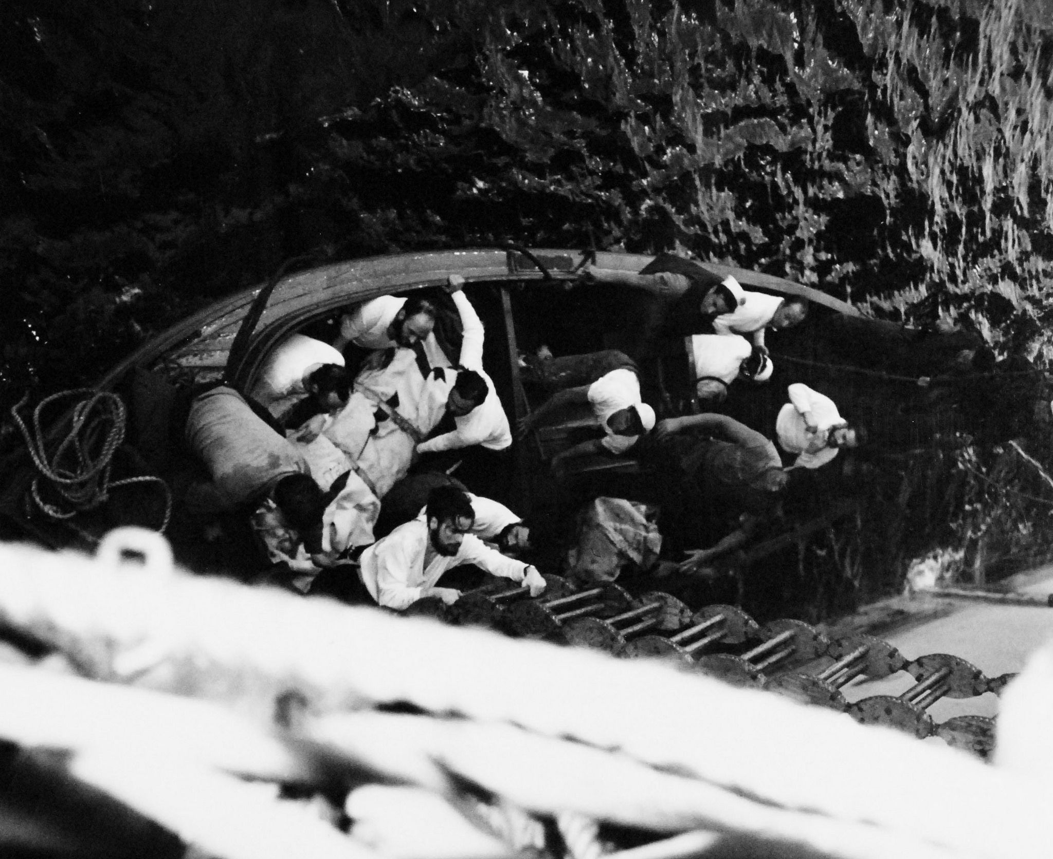 431k | German crewmen from the captured submarine, U-505, ascend a Jacobs ladder to board USS Guadalcanal (CVE-60). With them, they bring the body of the only casualty, a German sailor killed by strafing when he attempted to man a gun on board the U-boat, 4 June 1944. National Archives and Records Administration (NARA) photo, # 80-G-49173. |