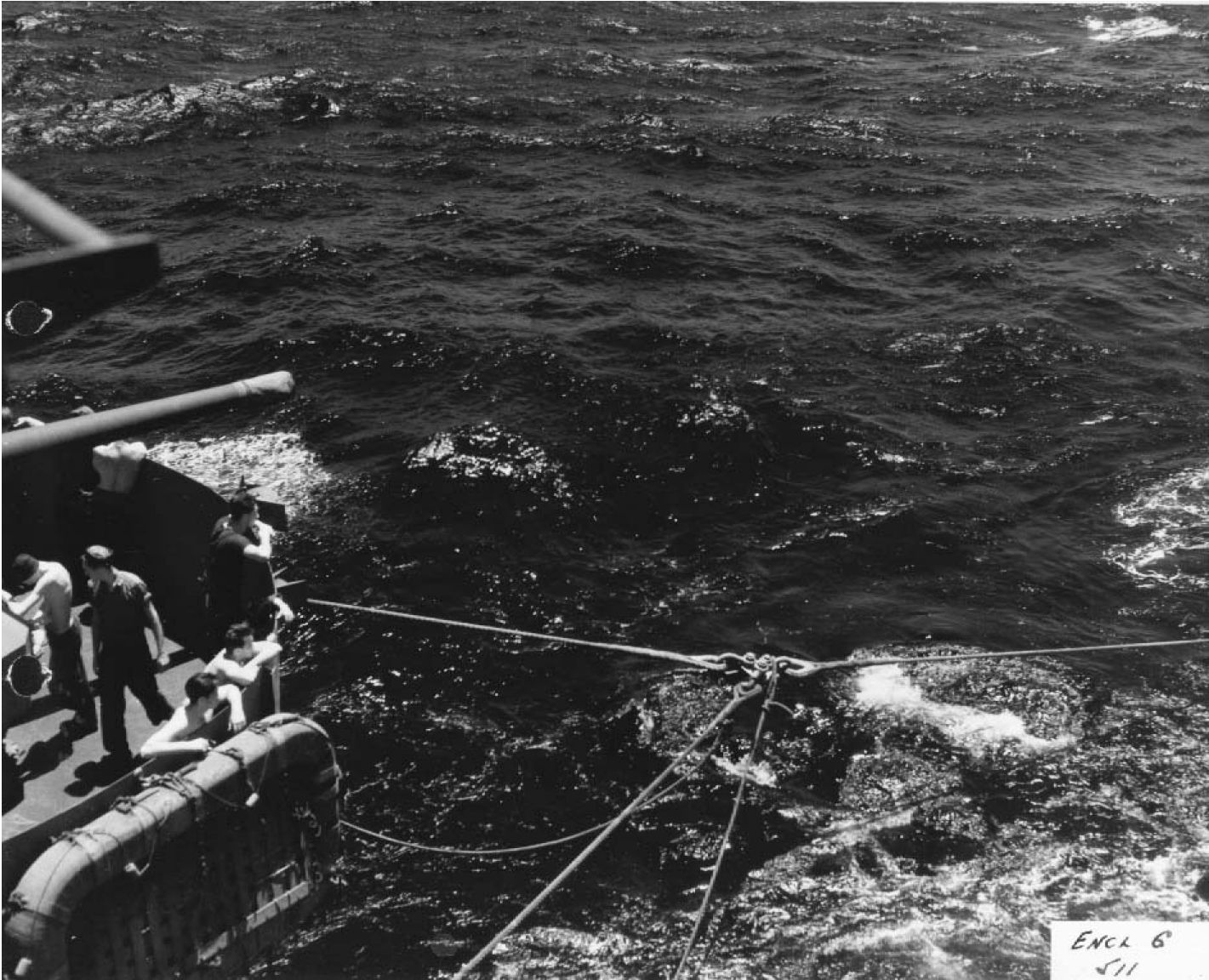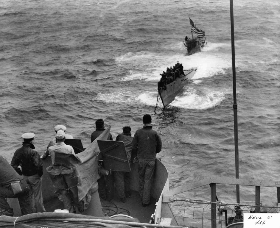 414k | Aerial view of one of the boarding parties as they came alongside of sub. Task Group 22.3 Report, Enclosure G, Photograph 429. |