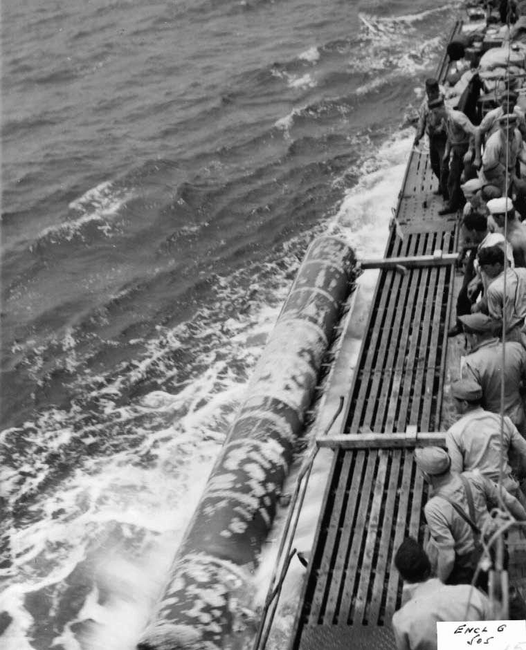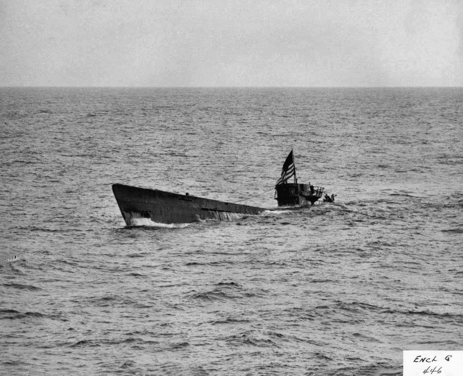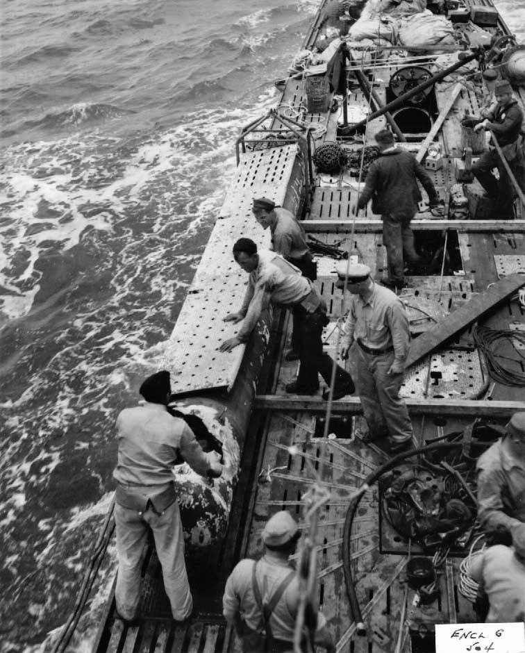 82k | Halftone reproduction of a photograph taken soon after U-505's capture (4 June 1944), copied from the "USS Guadalcanal (CVE-60) Memory Log, " page 28. U.S. Naval Officers shown on the submarine's conning tower are, from left to right: Commander Earl Trosino, USNR; Captain Daniel V. Gallery, Jr., USN, Commanding Officer, USS Guadalcanal; and Lieutenant Junior Grade Albert L. David, USN, who was posthumously awarded the Medal of Honor for leading the boarding party that captured the submarine and carried out initial salvage operations. Note the United States flag flying above the German Navy ensign. U-505 was the first enemy warship captured on the high seas by the U.S. Navy since 1815. Courtesy of the Naval Historical Foundation, Washington, DC. Naval History & Heritage Command photo (# NH 105857). |