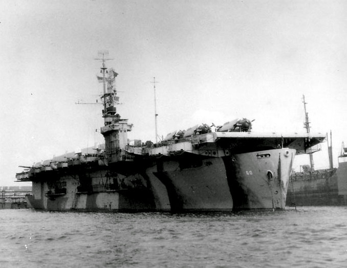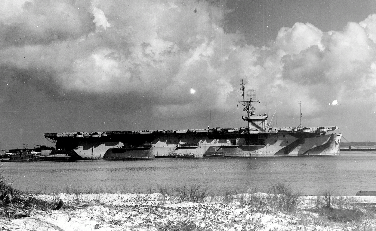 820k | Similar to the photo above, but clearer. Guadalcanal is painted in Measure 32 Design 4A camouflage scheme. National Archives and Records Administration (NARA) photo, # 80-G-383899. |