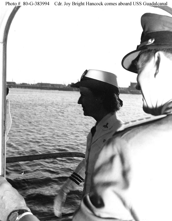 63k | Commander Joy Bright Hancock, USNR, is met by Captain B.C. McCaffree, USN, Commanding Officer, USS Guadalcanal (CVE-60), as she comes aboard his ship, 19 July 1945. Official U.S. Navy Photograph, now in the collections of the National Archives (# 80-G-383994). Joy Bright was born in Wildwood, New Jersey, on 4 May 1898. During World War I, after attending business school in Philadelphia, Pennsylvania, she enlisted in the Navy as a Yeoman (F), serving at Camden, New Jersey and at the Naval Air Station, Cape May. Following the war, she married Lieutenant Charles Gray Little, who was killed in the crash of the airship ZR-2 in 1921. A year later, she obtained employment with the Bureau of Aeronautics, where her duties included editing the Bureau's "News Letter," which later evolved into the magazine "Naval Aviation News." In 1924, she left the Bureau to marry Lieutenant Commander Lewis Hancock, Jr., who lost his life when USS Shenandoah (ZR-1) crashed in September 1925—subsequently, she sponsored USS Lewis Hancock (DD-675), named after her late husband. Joy Bright Hancock returned to the Bureau after attending Foreign Service School and obtaining a private pilot's license. For more than a decade before World War II and into the first year of that conflict, she was responsible for the Bureau's public affairs activities. In October 1942, she was commissioned a Lieutenant in the new Women's Reserve (WAVES). She initially served as WAVES representative in the Bureau of Aeronautics and later in a similar position for the Deputy Chief of Naval Operations (Air), rising to the rank of Commander by the end of the War. In February 1946, Commander Hancock became the Assistant Director (Plans) of the Women's Reserve and was promoted to WAVES' Director, with the rank of Captain, in July of that year. She guided the WAVES through the difficult years of Naval contraction in the later 1940s and the expansion of the early 1950s, a period that also saw the Navy's women achieve status as part of the Regular Navy. Captain Hancock retired from active duty in June 1953. The next year, she married Vice Admiral Ralph A. Ofstie and accompanied him on his 1955–56 tour as Commander, Sixth Fleet. Following her husband's death in late 1956, she lived in the Washington, D.C., area and in the Virgin Islands. She died on 20 August 1986. |