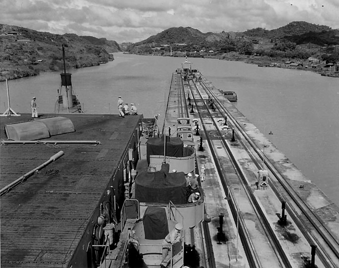 92k | USS Guadalcanal (CVE-60) passing through Panama Canal, canal lock Pacific side, 26 November 1943. National Archives photo. |