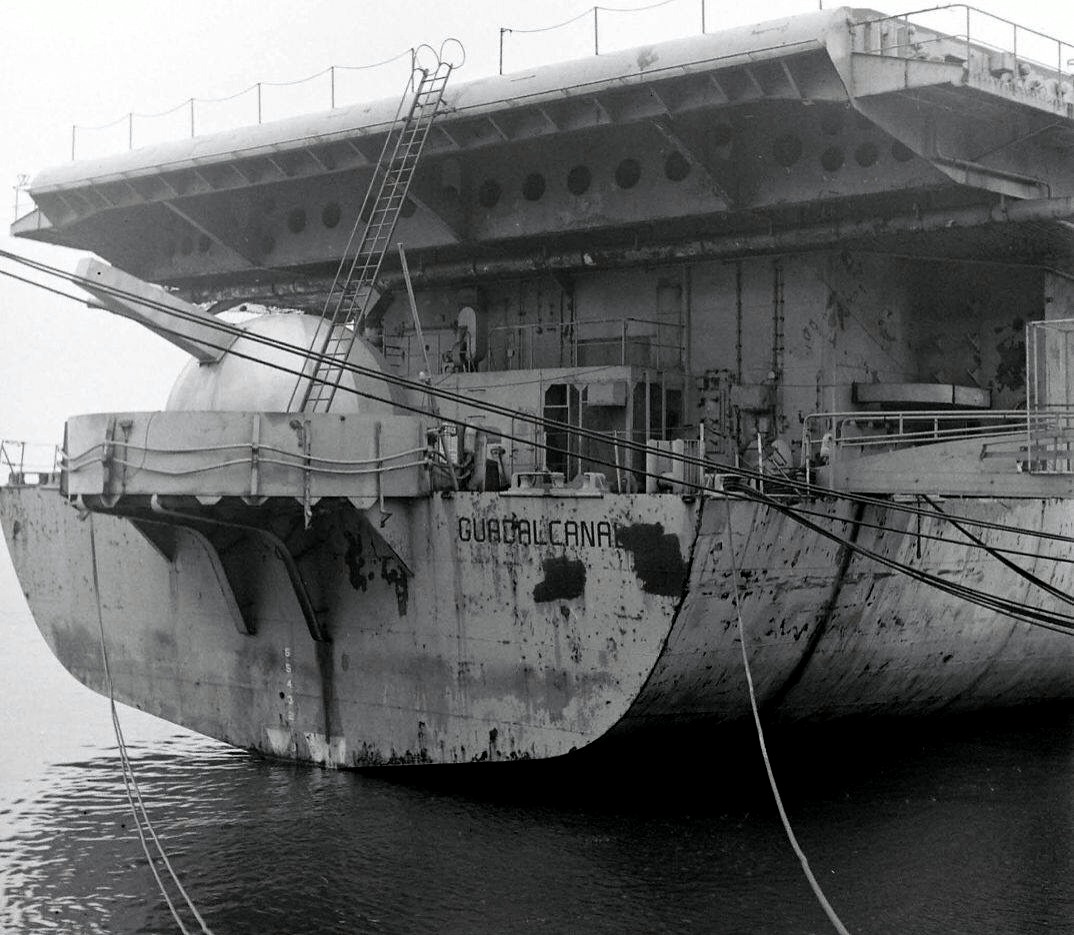 222k | Stern view of ex-USS Guadalcanal (CVE-60) in mothballs, February 1950. The ship was part of the Atlantic Reserve Fleet and was moored at Bayonne, New Jersey. LIFE Magazine Archives, Herbert Gehr photographer, shared by Peter DeForest (for educational and non-commercial use only). |