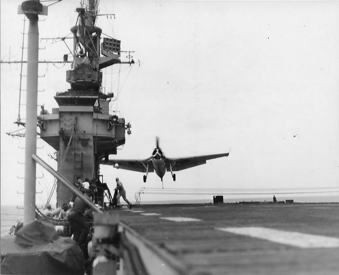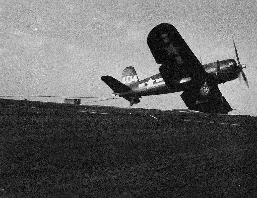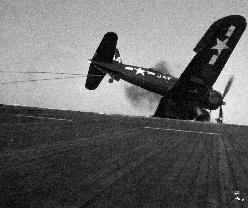 1001k | Crash of an F4U Corsair into catwalk aboard USS Guadalcanal (CVE-60), 5 April 1945. National Archives and Records Administration (NARA) photo, # 80-G-383978. |