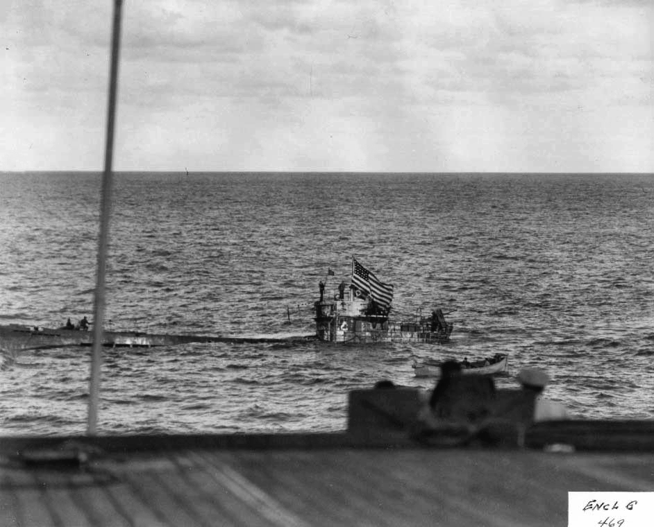 244k | U.S. Colors fly over captured U-505. Note U-505's emblem, a seashell, painted on the sail. |