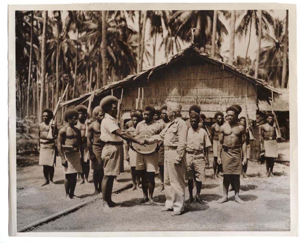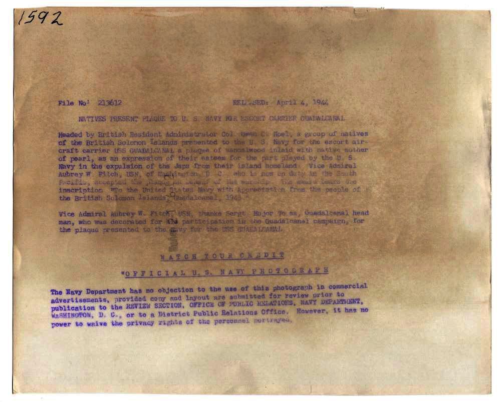 136k | "File No: 213612 Released: April 4, 1944" "NATIVES PRESENT PLAQUE TO U.S. NAVY FOR ESCORT CARRIER GUADALCANAL" "Headed by British Resident Administrator Col. Owen C. Noel, a group of natives of the British Solomon Islands presented to the U.S. Navy for the escort aircraft carrier USS Guadalcanal a plaque of sandalwood inlaid with native mother of pearl, as an expression of their esteem for the part played by the U.S. Navy in the expulsion of the Japs from their island homeland. Vice Admiral Aubrey W. Fitch, USN, of Washington D.C., who is now on duty in the South Pacific, accepted the plaque on behalf of the warship. The award bears the inscription 'To the United States Navy with Appreciation from the people of the British Solomon Islands, Guadalcanal, 1943.'" "Vice Admiral Aubrey W. Fitch, USN, thanks Sergt Major Vouza, Guadalcanal head man, who was decorated for his participation in the Guadalcanal campaign, for the plaque presented to the Navy for the USS Guadalcanal" Duane adds a historical note about Sir Jacob C. Vouza: "He was captured by the Japanese, tortured, and bayoneted repeatedly and left to die. He managed to free himself and made it to Marine lines and gave them a 10-minute warning about the Japanese attack on the Tenaru River. The Battle of the Tenaru was a clear Marine victory. He passed away in 1984." |