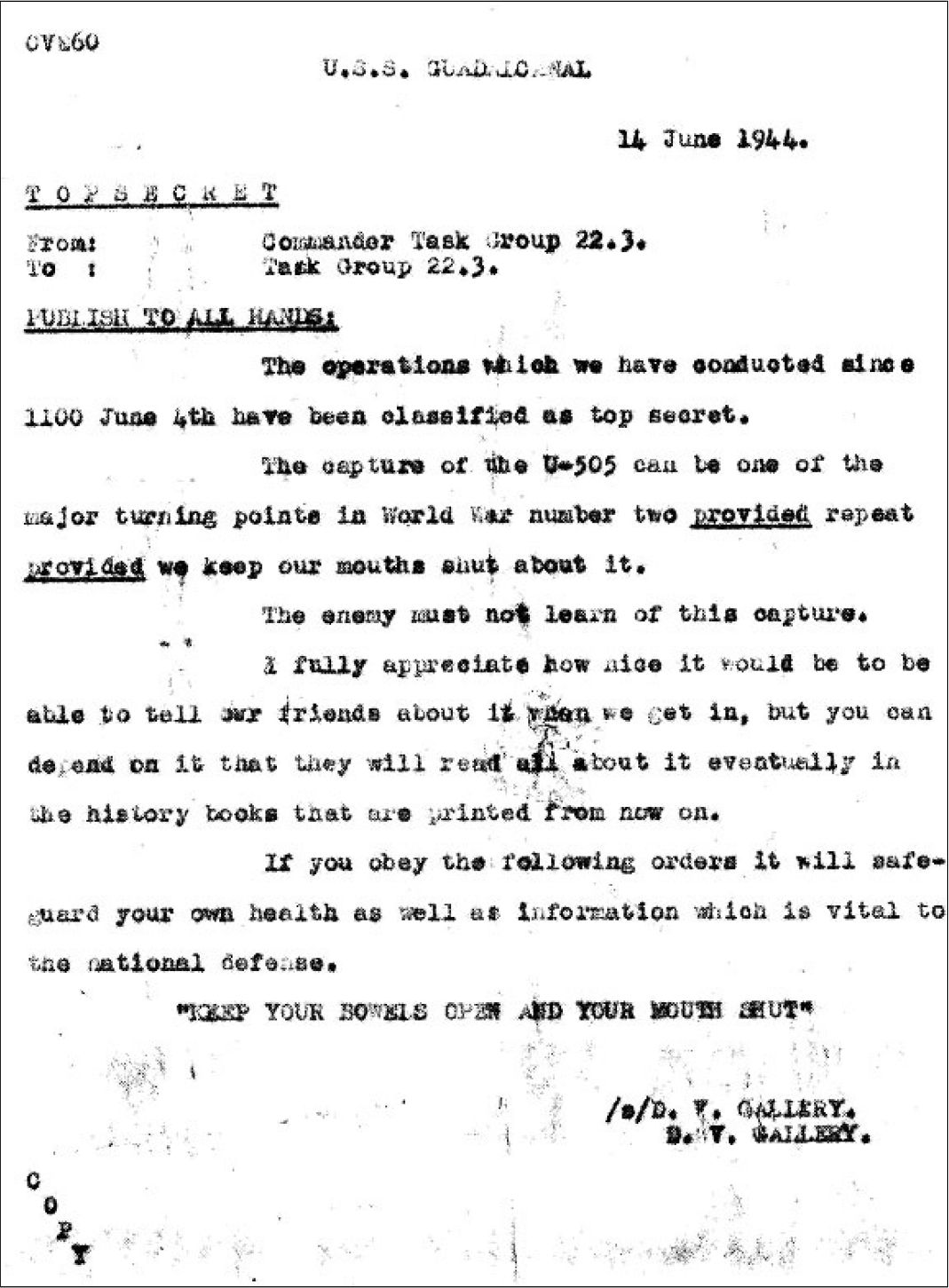 185k | Memo from CAPT Gallery to all hands of Task Group 22.3, 14 June 1944. "The operations which we have conducted since 1100 June 4th have been classified as top secret." |