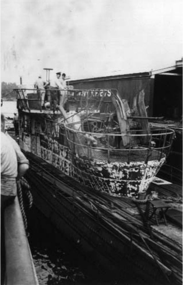 69k | U-505's conning tower emblems are covered with tarps, damage from 3"/50 caliber gunfire is apparent. |