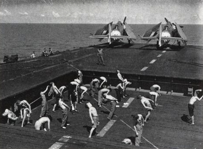 200k | German prisoners of war from the captured submarine U-505 exercise on the forward elevator of the U.S. Navy escort carrier USS Guadalcanal (CVE-60), in June 1944. Note the General Motors TBM-1C Avengers of Composite Squadron (VC) 8 parked on the bow. U.S. Navy photo from the Guadalcanal World War II Cruise Book. |