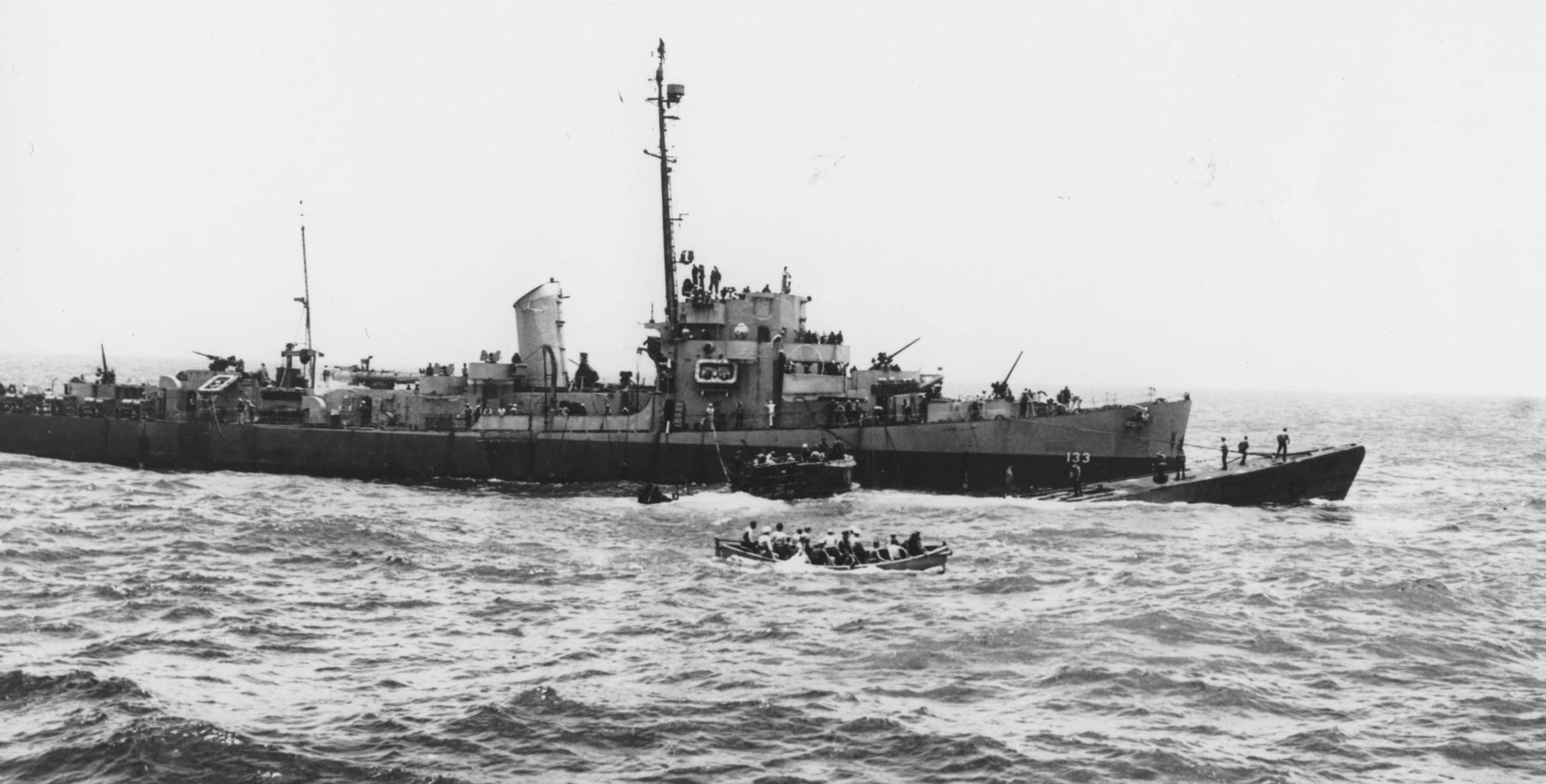 180k | "Depth charges dropped by U.S. Navy destroyer escorts explode near the German submarine U-505 in the Atlantic Ocean on 4 June 1944." |