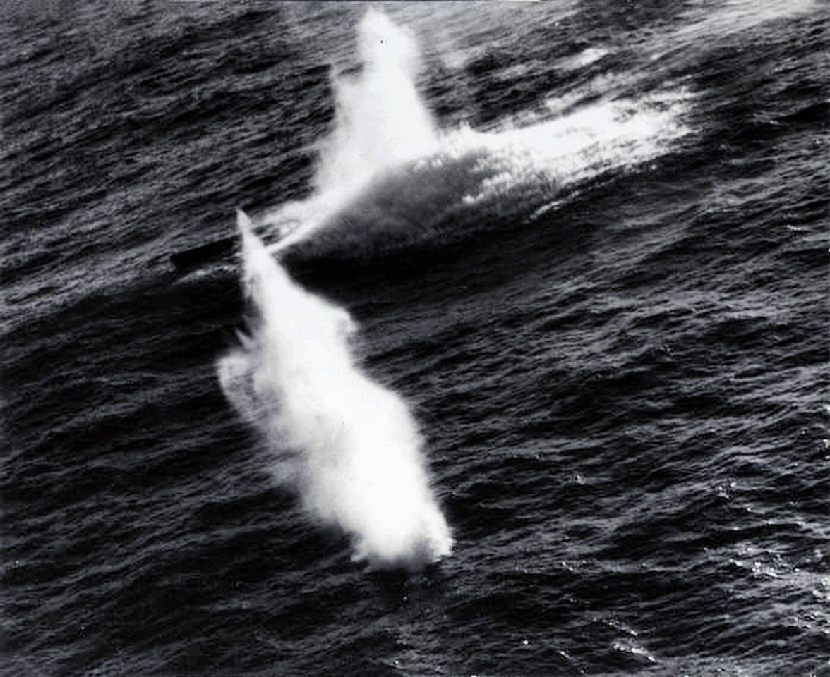 749k | ENS McLane's Mk.47 depth bombs explode close to U-544's port side. |