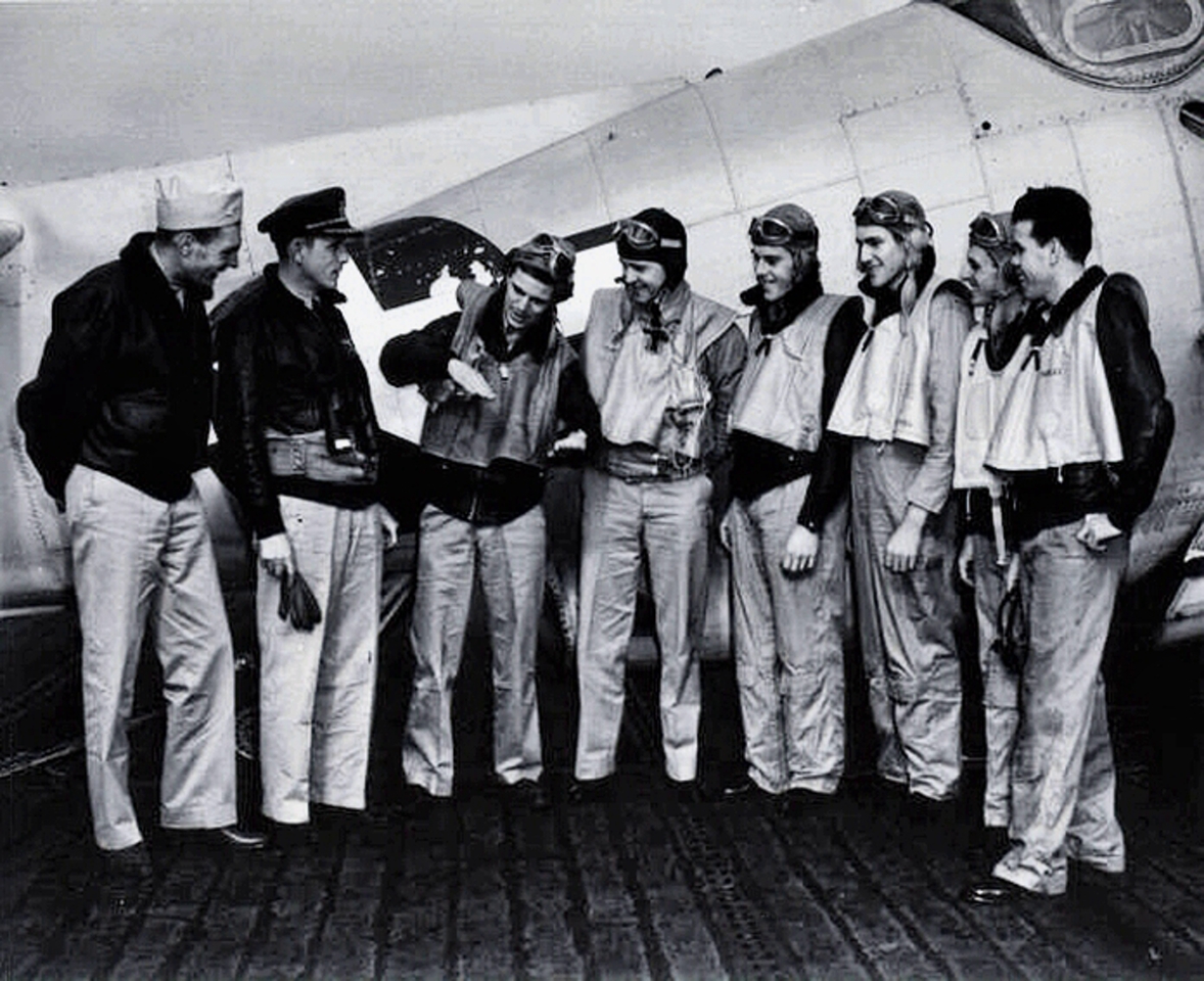 713k | Left to right: LCDR Adrian H. Perry (CO of VC-13), CAPT Daniel V. Gallery, Jr. (CO of Guadalcanal), ENS William M. McLane and his crew (AOM2c A.J. Dodd and ARM2c A.C. Torres, aircraft #21) and ENS Bert J. Hudson and his crew (AOM2c P. Schwahn and ARM3c R.J. Horacek, TBF #12). |