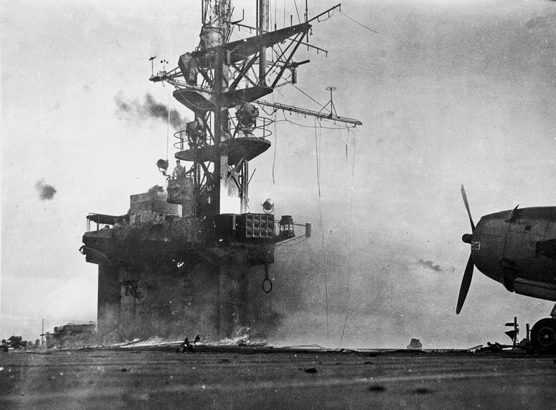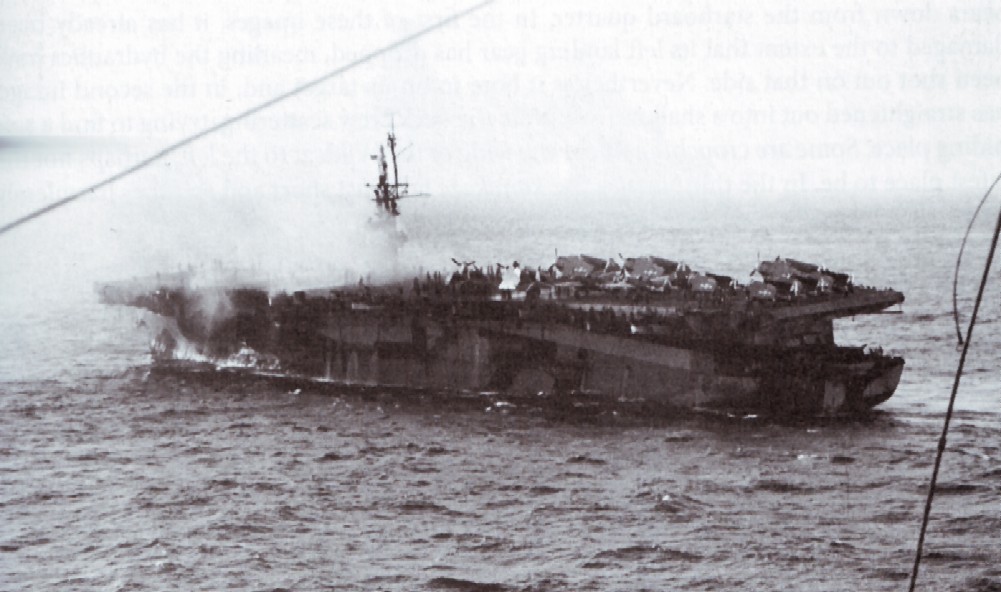 118k | As seen from USS West Virginia (BB-48), Manila Bay is shown burning after Kamikaze hit on January 5, 1945. Gene Chapman recalls: The kamikaze "came in low like a bucking bronco on the starboard side and just before hitting us pulled up and it appeared to me he was afraid to hit the ship; he pulled straight up and flipped back and hit our catapult and destroyed it completely. After we got hit there were electrical fires and the ship was listing. I knew there was a pilots life raft hanging on a rope on the fantail. I took my knife [and] cut the rope. The men were in panic. I pulled the CO2 and blew up the life raft and was placing it over the side. An officer pulled a gun on me and threatened to shoot me. If the ship had started to sink he would just have had to shoot. I think he wanted the raft for the officers. […] One man was charred from the hit and blown over the side. Our men were about to shoot him thinking he was a Jap. The last thing he could remember was he raised his hand and screamed "God/dmn it. I'm an American." He was brought aboard and was badly burned." "The ship's crew worked all night installing new planking. Our very BRAVE pilots took off with NO catapult carrying a FULL BOMB LOAD. When the plane left the flight deck the plane tails dropped to the water throwing a rooster tail for quite some distance. By the time the plane got to the horizon (approximately 10 miles) they were no much more than the height of a home off the water. I was on the flight deck as these things took place. I was a plane captain and had my own plane to care for." From Fire From The Sky, by Robert C. Stern, submitted by Robert Hurst: "The Zeke exploded in the hangar, but the fire mains remained intact and the crew was able to contain the resulting fire to two aircraft parked there. That was fortunate, as [this photo] shows, her greatest luck was that the Zeke did not hit further aft, where a deck park of fueled and armed Avengers and Wildcats were waiting to be launched." |