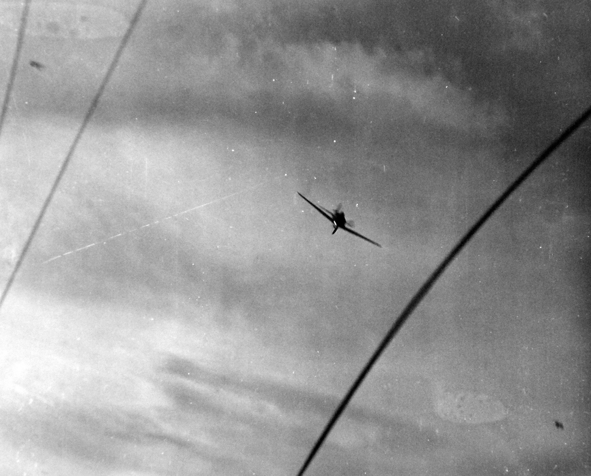 1.34M | Japanese Zeke fighter-bomber attempting aerial attack on USS Manila Bay (CVE-61) in Sulu Sea during operations in support of Mindoro Island, Philippine Islands. Note Japanese fighter-bomber hit by anti-aircraft fire and out of control to the right after attempting an attack. Photograph, 15 December 1944. Official U.S. Navy photograph, now in the collections of the National Archives & Records Administration (NARA), # 80-G-304453). |