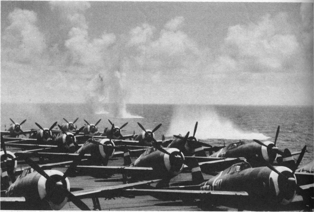 220k | USS Manila Bay (CVE-61) came under enemy air attack on June 23, 1944 east of Saipan. Two fighter-bombers attacked her from dead ahead, dropping four bombs which missed their target — note bombs splashing wide to port. Manila Bay was transporting 37 Army P-47 Thunderbolts from 73rd Fighter Squadron, 318th Fighter Group and, as a precautionary and rather unusual move which Admiral Spruance later characterized as "commendable initiative," four of them were launched to fly protective CAP until radar screens were clear of contacts. The Army fighters then flew to Saipan, their intended destination. |