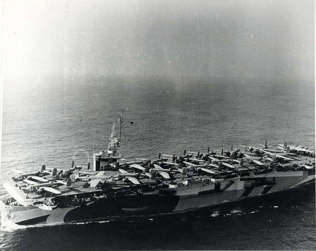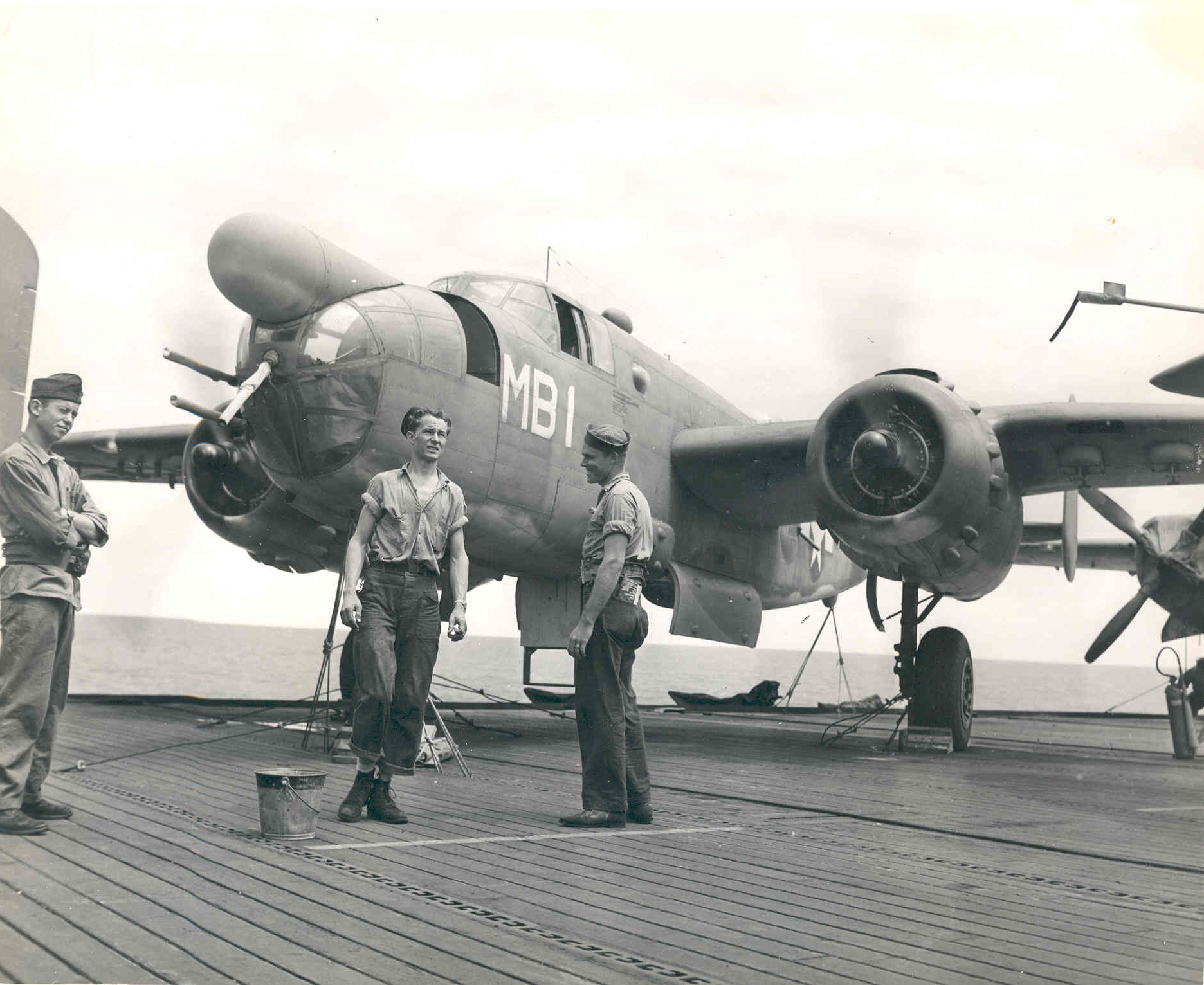 117k | USS Manila Bay (CVE-61) en route from San Diego to Pearl Harbor, 24–31 August 1944, with 14 PBJ-1D Mitchells from Marine Bombing Squadron (VMB) 611 and three JM-1 Marauders. Manila Bay is camouflaged in Measure 32, Design 12A. |