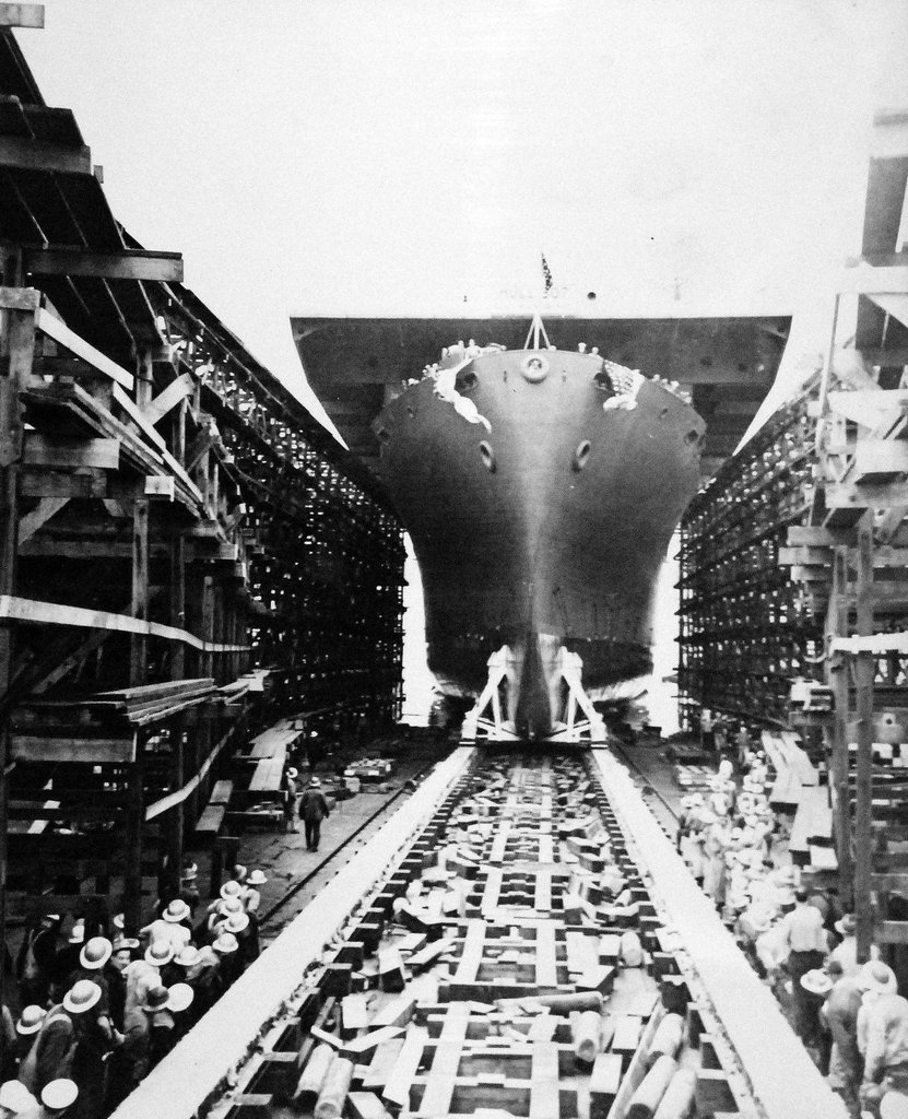 202k | Manila Bay (CVE-61) sliding down the ways at the Kaiser Vancouver, WA, yard, Saturday, 10 July 1943. National Archives and Records Administration (NARA) photo, # 80-G-372761. |