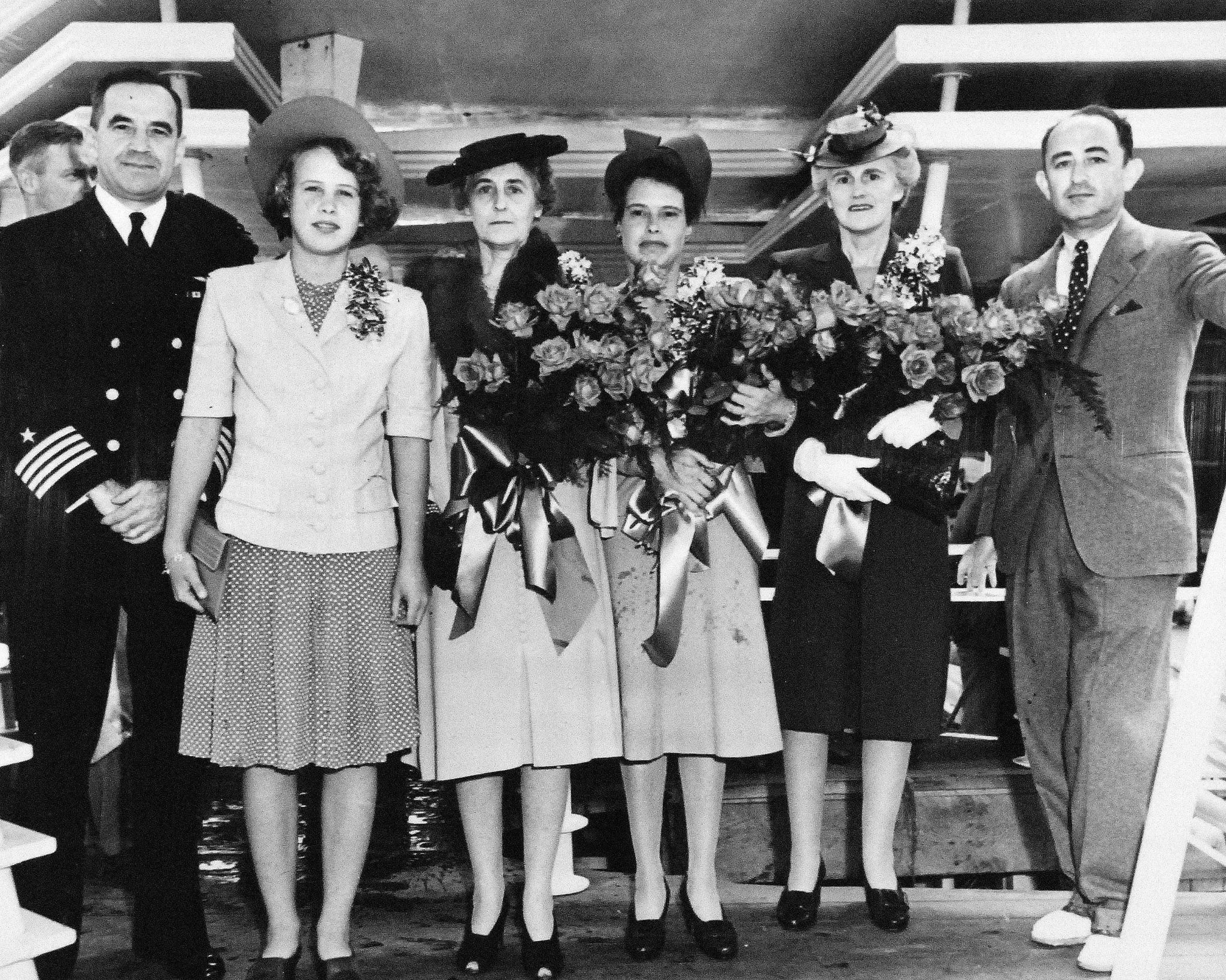 988k | Ship's Sponsor Mrs. Robert W. Bockius and sponsor party of USS Manila Bay (CVE-61), Kaiser Company Inc., Vancouver, Washington, 10 July 1943. National Archives and Records Administration (NARA) photo, # 80-G-327763. |