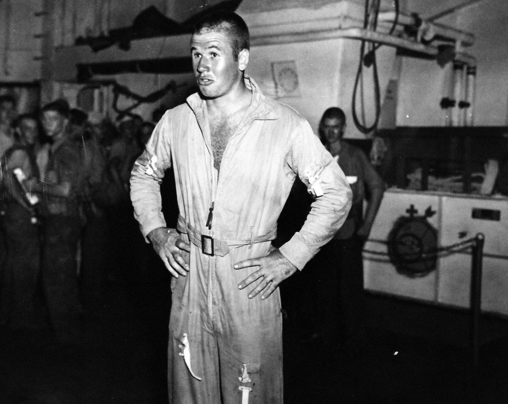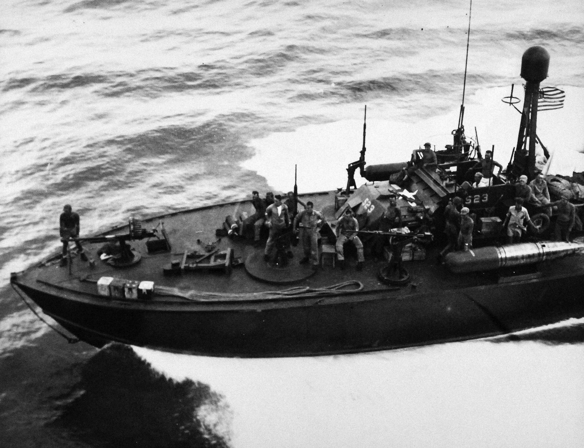 714k | Ensign Ray Crandell, TBM Pilot of VC-80, and his air crewman who were brought back aboard USS Manila Bay (CVE-61) by U.S. Navy motor torpedo boat PT-523 after they were shot down over Leyte Island beachhead, Philippines, 22 October 1944. National Archives & Records Administration (NARA) photo (# 80-G-372892). |