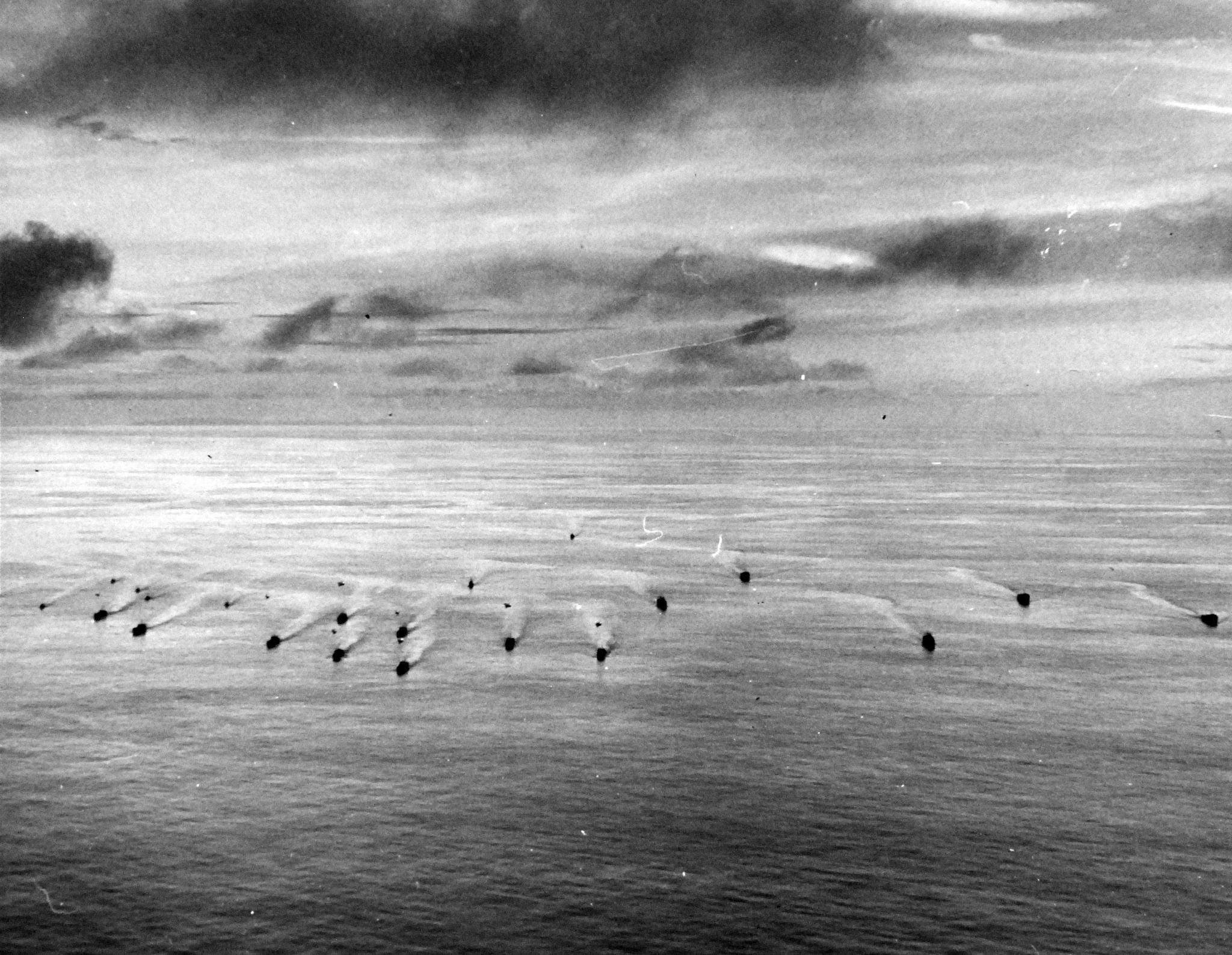 749k | Part of Task Force 77 enroute to Aitape, New Guinea, for invasion. Photographed by a plane from USS Manila Bay (CVE-61), 21 April 1944. Official US Navy photograph, now in the collections of the National Archives and Records Administration (NARA), photo No. 80-G-227952. |