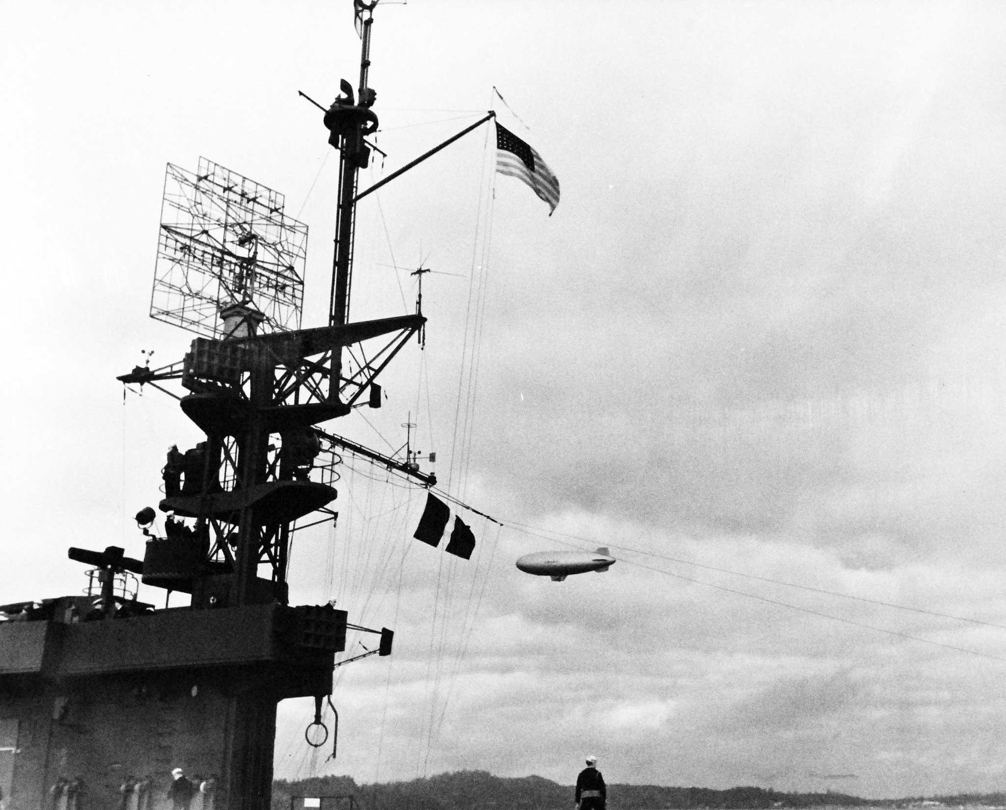 897k | Blimp escorting USS Manila Bay (CVE-61). Note flying flag and radar antenna. Date is 28 October 1943. National Archives and Records Administration (NARA), photo # 80-G-372774. |