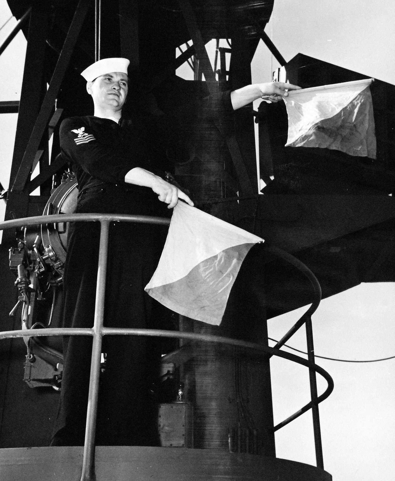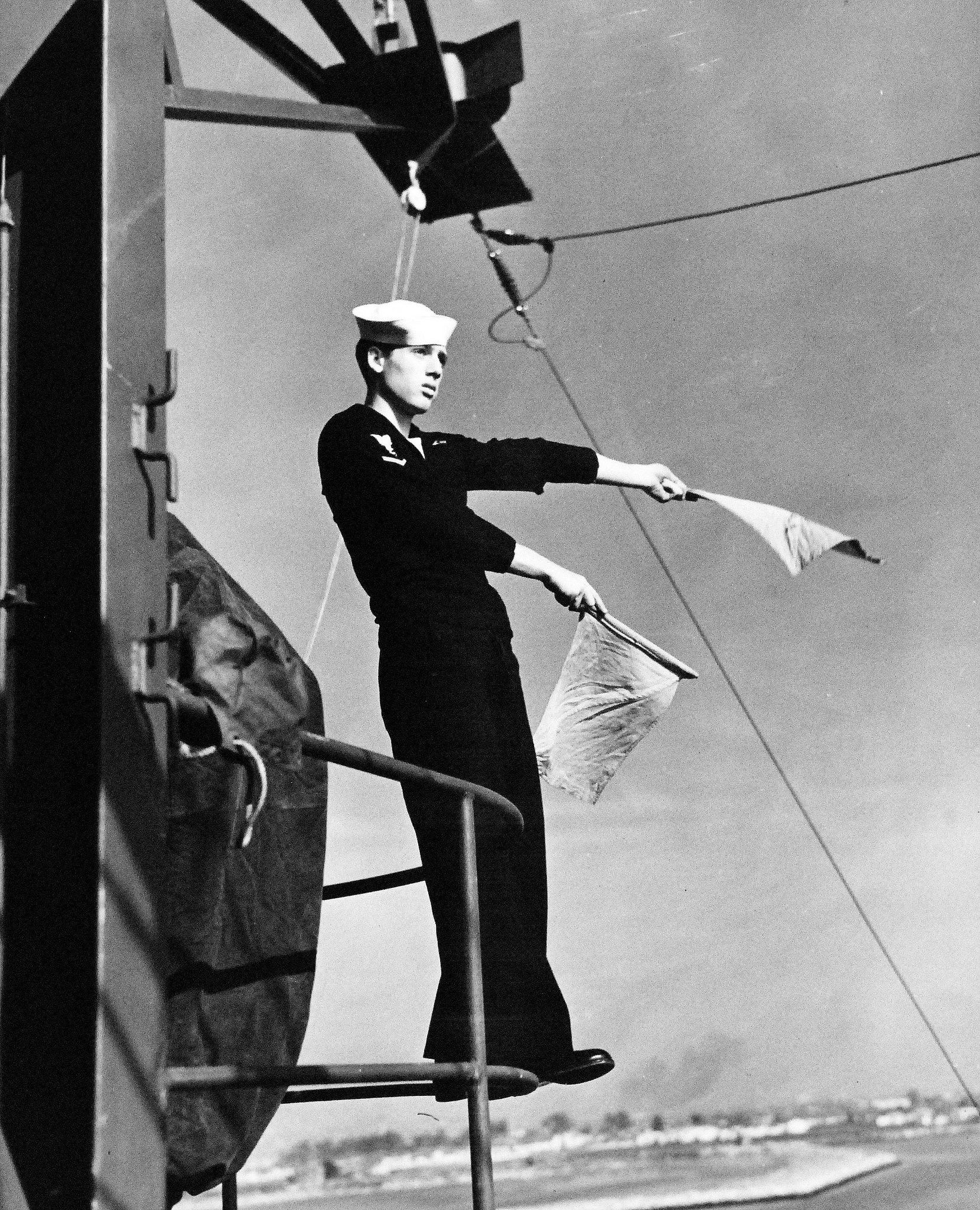940k | Activities aboard USS Manila Bay (CVE-61): Signalman sending message by semaphore, 11 November 1943. National Archives and Records Administration (NARA), photo # 80-G-372782. |