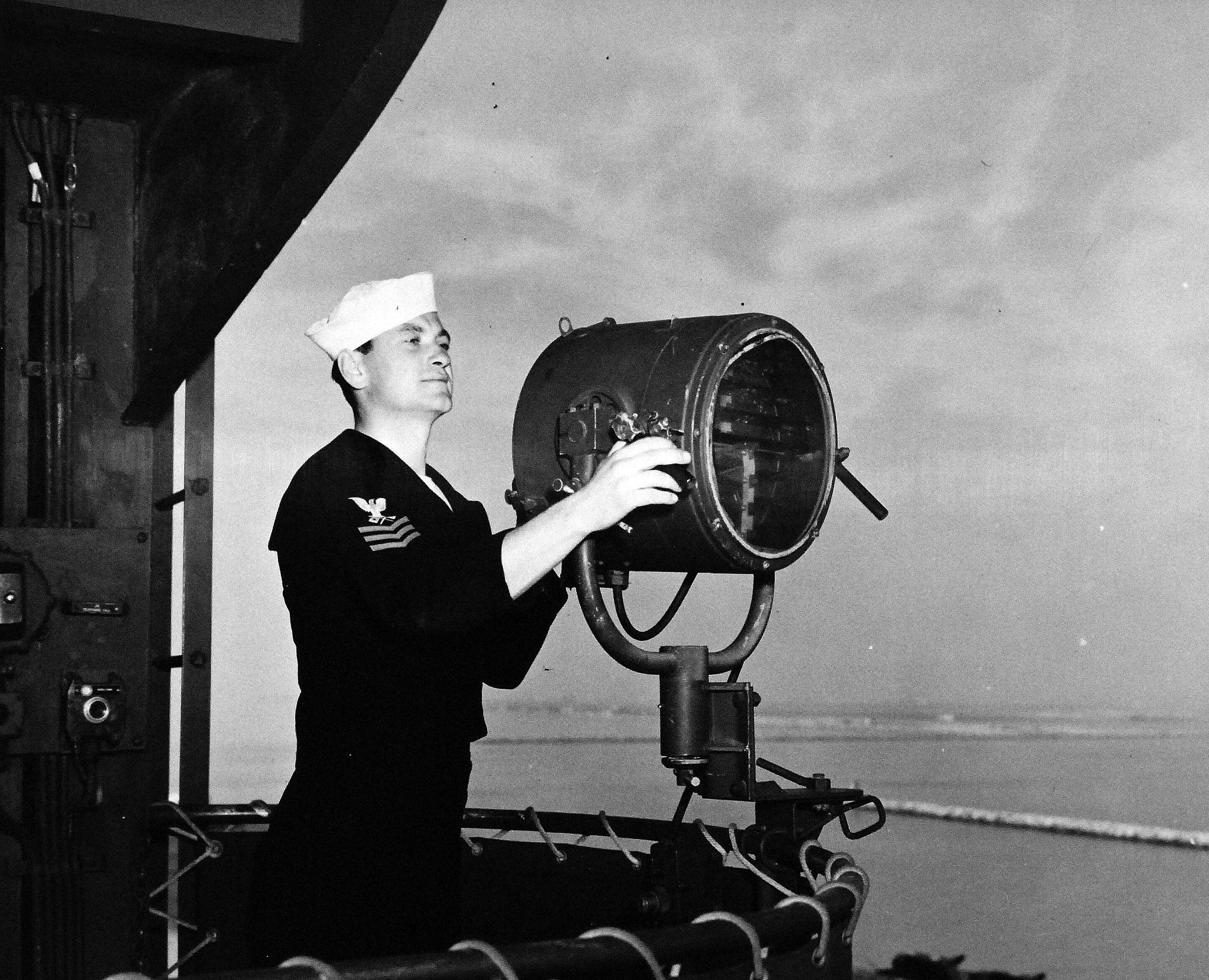 750k | Activities aboard USS Manila Bay (CVE-61): Signalman sending blinker message, 11 November 1943. National Archives and Records Administration (NARA), photo # 80-G-372780. |
