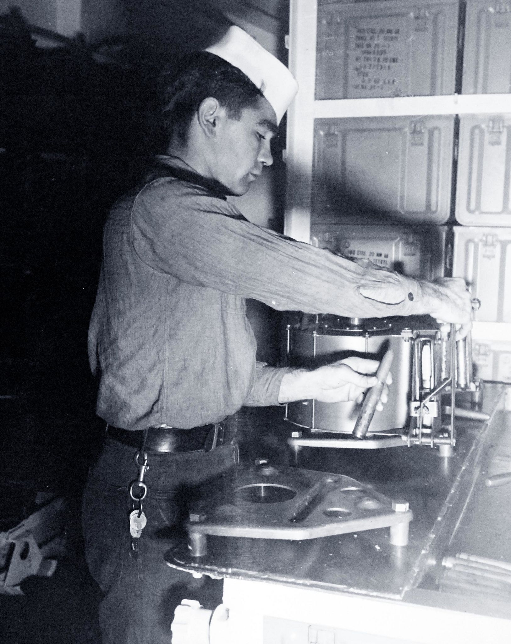 521k | Activities aboard USS Manila Bay (CVE-61): Loading 20mm magazine, 11 November 1943. National Archives and Records Administration (NARA), photo # 80-G-372785. |