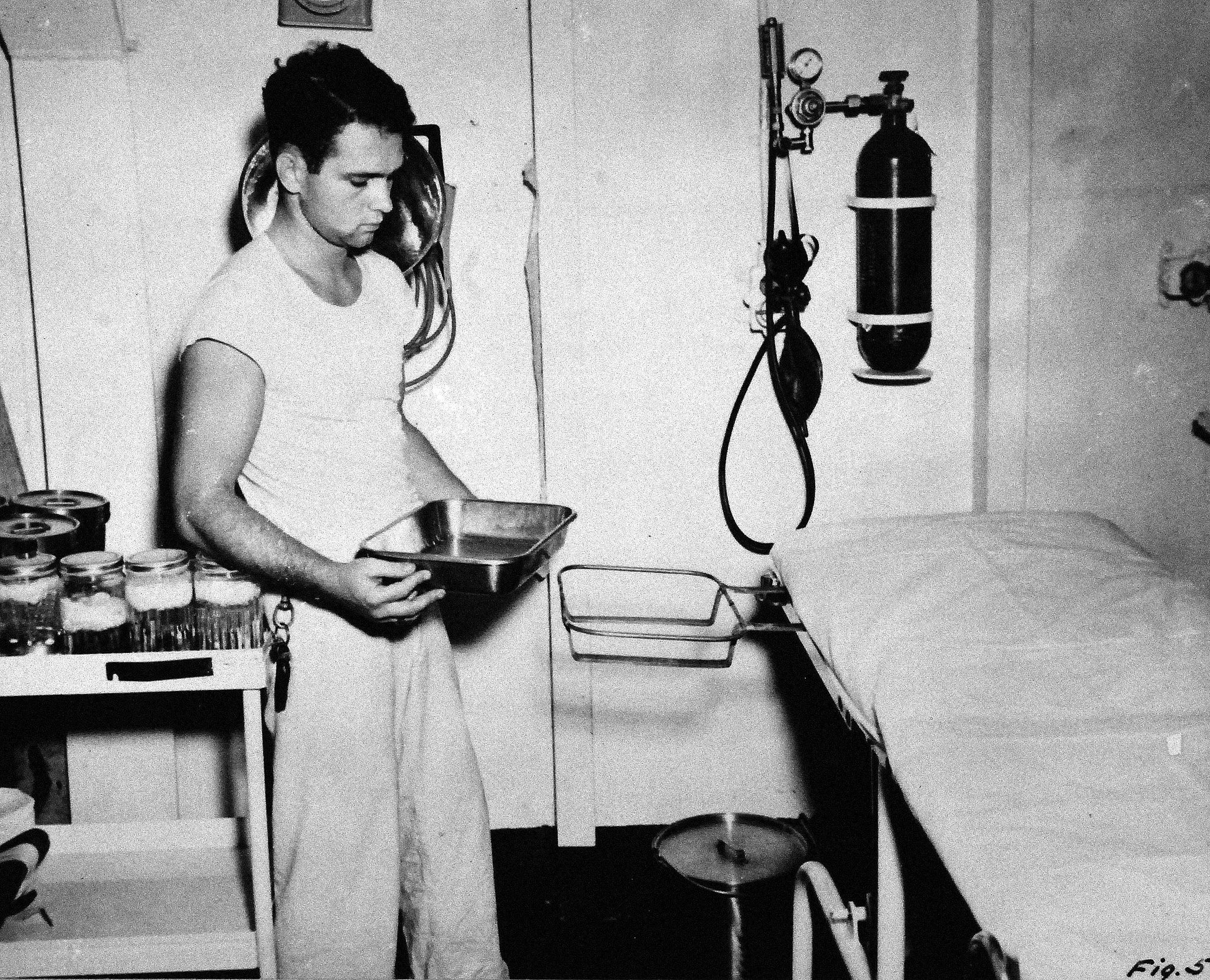 1.37M | Medical corpsman holding tray while at work in the sick bay aboard USS Manila Bay (CVE-61), 11 September 1944. National Archives & Records Administration (NARA) photo (# 80-G-372847). |