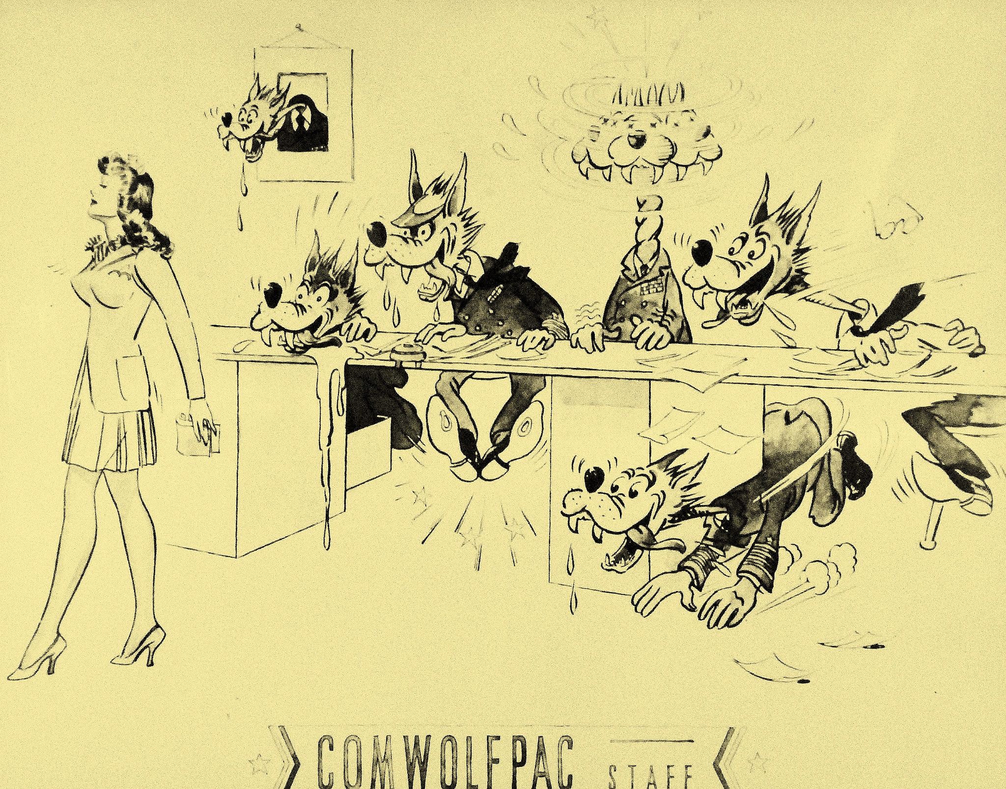 1.09M | Copy of COMWOLFPAC cartoon from USS Manila Bay (CVE-61), 1 November 1943. National Archives and Records Administration (NARA), # 80-G-372766. |