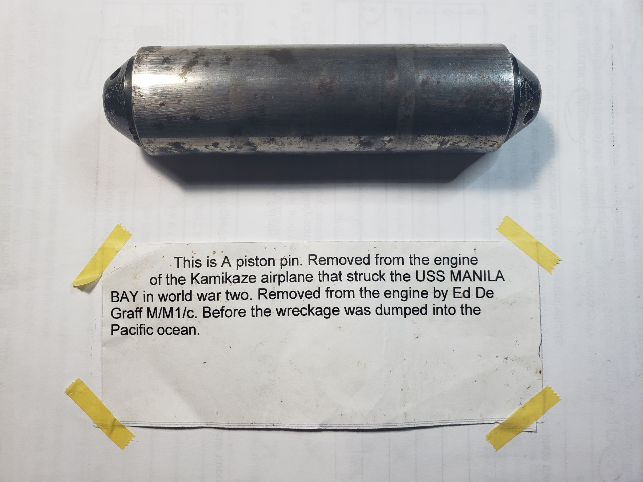 273k | A piston pin recovered by Edgar DeGraff from the Kamikaze that hit USS Manila Bay (CVE-61) on 5 January 1945, including a description typed up by him. |