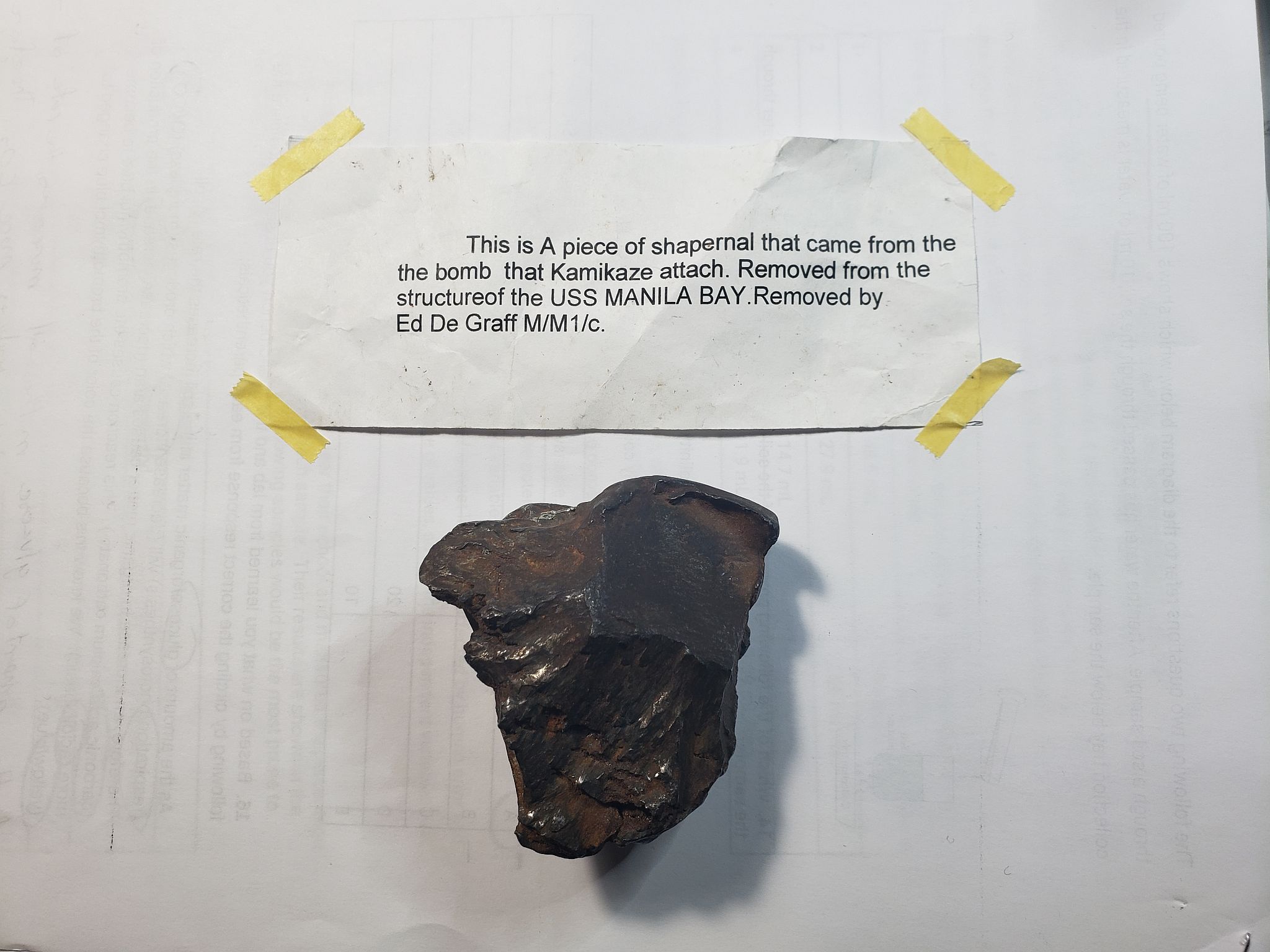 259k | A piece of debris recovered from the carrier deck by Edgar DeGraff following the attack and subsequent fire, along with an accompanying caption describing the object. |
