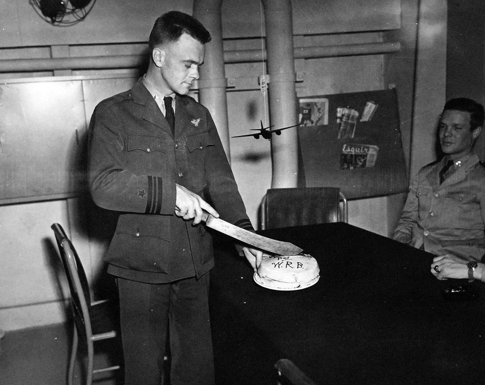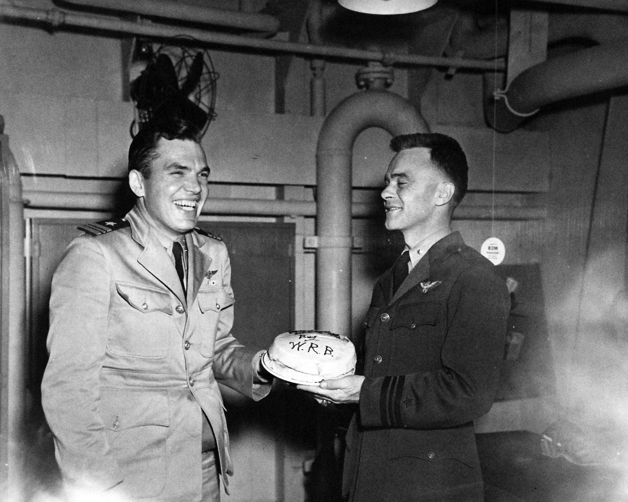 788k | Composite Squadron (VC) 7 officers celebrating first landing aboard USS Manila Bay (CVE-61) with presentation of a cake to Squadron Commander, Lieutenant Commander Wilson R. Bartlett, who is cutting the cake, with Lieutenant Commander Lee, Air Officer, in the background. The photo is dated 12 July 1943, but this cannot be correct, as the carrier was still under construction. A more likely date is 7 December 1943. National Archives and Records Administration (NARA), photo # 80-G-372810. |