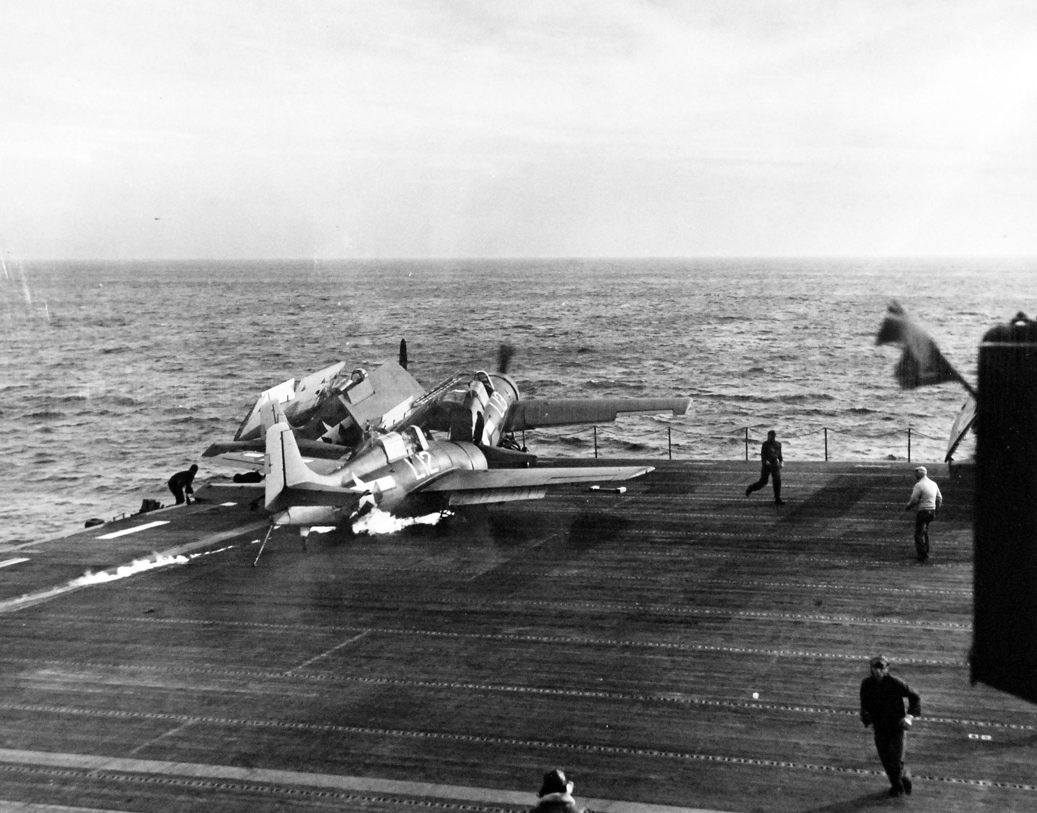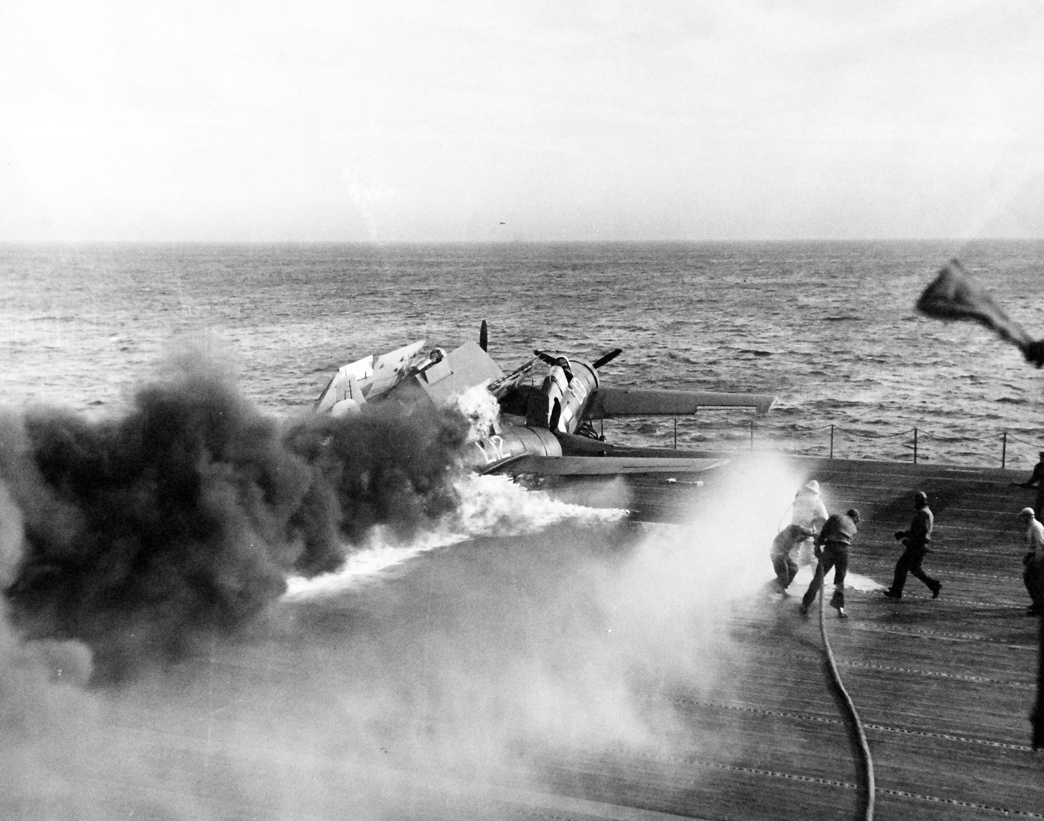 683k | Crew combating fire after Japanese kamikaze crashed into the ship's flight deck at Luzon, South China Sea, during operations in support of the invasion of Luzon. Photograph by USS Manila Bay (CVE-61), released 5 January 1945. Official U.S. Navy photograph, now in the collections of the National Archives and Records Administration (NARA), # 80-G-273184. |