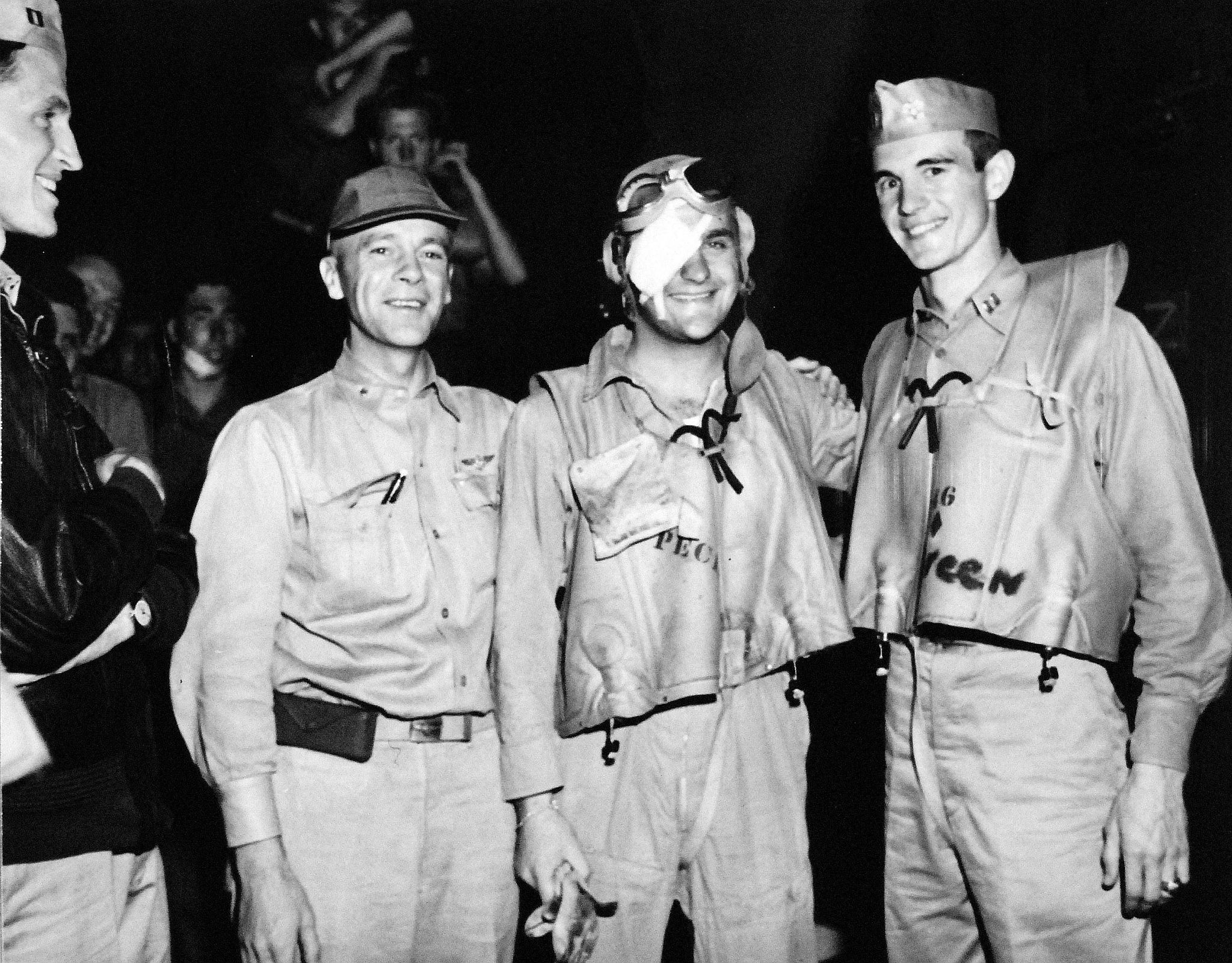 708k | Lieutenant (Junior Grade) Peck being transferred from USS Coghlan (DD-606) to USS Manila Bay (CVE 61) after rescue at sea, 15 January 1944 (see above). Shown are the Air Department officers after greeting LT(JG) Peck aboard. Left to right: Flight Surgeon Christy; Lieutenant Commander Bartlett, Air Officer; Lieutenant (Junior Grade) Peck; and Lieutenant Breen, Squadron Captain. Official US Navy photograph, now in the collections of the National Archives and Records Administration (NARA), photo No. 80-G-372860. |
