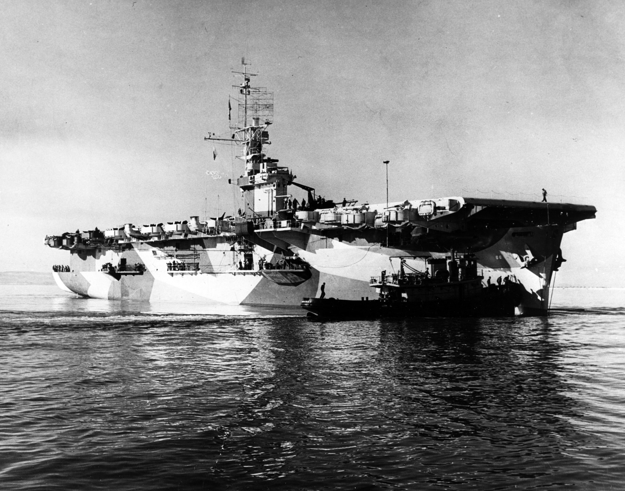 619k | USS White Plains (CVE-66) in San Diego harbor, California, circa April 1944. She is being assisted by the harbor tug Wenonah (YT-148). White Plains is painted in Camouflage Measure 33, Design 10A. Official U.S. Navy Photograph, now in the collections of the National Archives and Records Administration (NARA), #80-G-302258. |